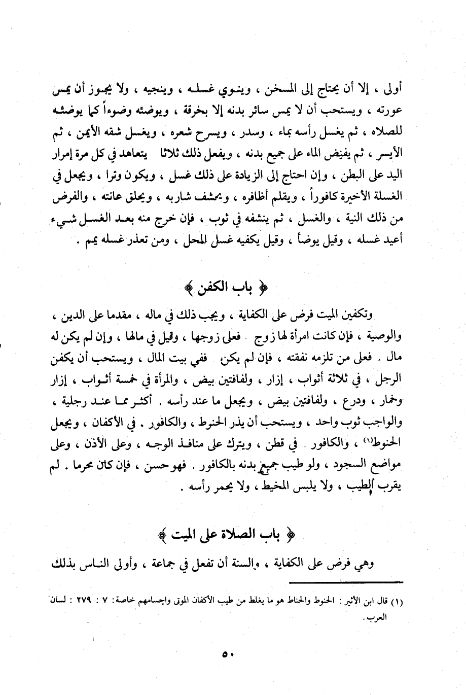وتكفين الميت فرض على الكفاية ويجب ذلك في ماله مقدما على الدين والوصية فان كانت امرأة لها زوج فعلى زوجها, وقيل في مالها وان لم يكن له مال فعلى من تلزمه نفقته فان لم يكن ففي بيت المال ويستحب أن يكفن الرجل في ثلاثة أثواب ازار ولفافتين بيض والمرأة في خمسة أثواب ازار وخمار ودرع ولفافتين بيض ويجعل ما عند رأسه أكثر مما عند رجليه والواجب ثوب واحد ويستحب أن يذر الحنوط والكافور في الأكفان ويجعل الحنوط1 والكافور في قطن ويترك على منافذ الوجه وعلى الأذن, وعلى مواضع السجود ولو طيب جميع بدنه بالكافور فهو حسن فإن كان محرما لم يقرب الطيب ولا يلبس المخيط ولا يحمر رأسه.