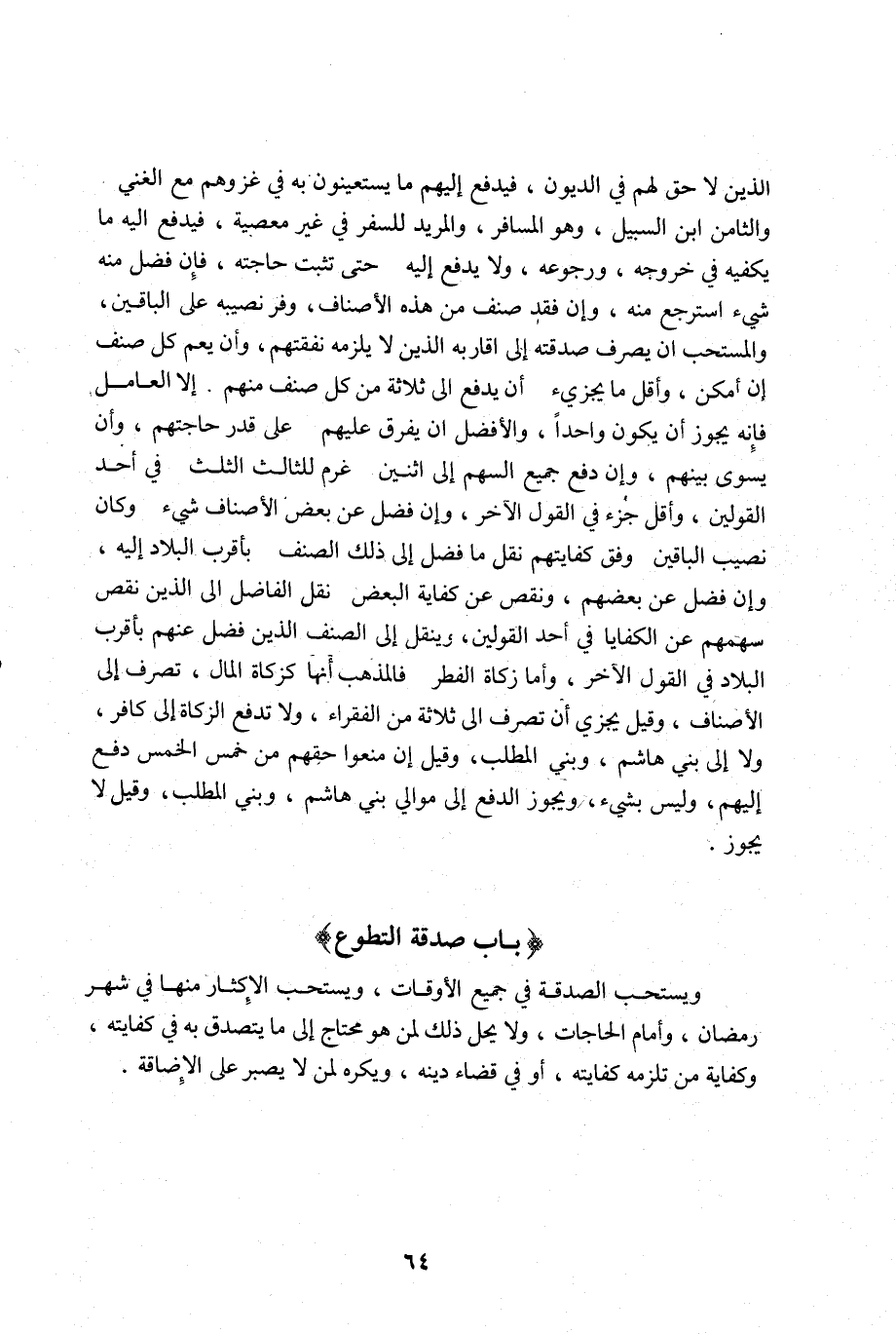 الذين لا حق لهم في الديون فيدفع اليهم ما يستعينون به في غزوهم مع الغني والثامن ابن السبيل وهو المسافر والمريد للسفر في غير معصية فيدفع اليه ما يكفيه في خروجه ورجوعه ولا يدفع اليه حتى تثبت حاجته فان فضل منه شيء استرجع منه وان فقد صنف من هذه الأصناف وفر نصيبه على الباقين والمستحب أن يصرف صدقته الى أقاربه الذين لا يلزمه نفقتهم وأن يعم كل صنف ان أمكن وأقل ما يجزيء أن يدفع الى ثلاثة من كل صنف منهم الا العامل فإنه يجوز أن يكون واحدا والأفضل أن يفرق عليهم على قدر حاجتهم وأن يسوي بينهم وان دفع جميع السهم الى اثنين غرم للثالث الثلث في أحد القولين وأقل جزء في القول الآخر وان فضل عن بعض الأصناف شيء وكان نصيب الباقين وفق كفايتهم نقل ما فضل الى ذلك الصنف بأقرب البلاد اليه وان فضل عن بعضهم ونقص عن كفاية البعض نقل الفاضل الى الذين نقص سهمهم عن الكفايا في أحد القولين وينقل الى الصنف الذين فضل سهمهم أقرب البلاد في القول الآخر وأما زكاة الفطر فالمذهب أنها كزكاة المال تصرف الى الأصناف وقيل يجزي أن تصرف الى ثلاثة من الفقراء ولا تدفع الزكاة الى كافر ولا الى بني هاشم وبني المطلب وقيل ان منعوا حقهم من خمس الخمس دفع اليهم وليس بشيء ويجوز الدفع الى موالي بني هاشم وبني المطلب وقيل لا يجوز.