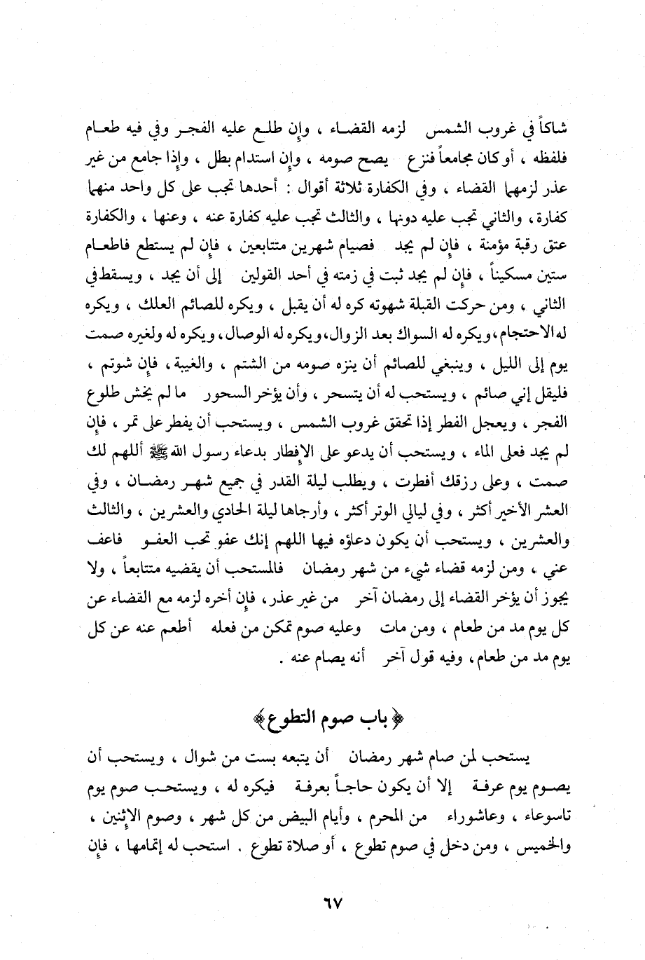 شاكا في غروب الشمس لزمه القضاء وان طلع عليه الفجر وفي فيه طعام فلفظه أو كان مجامعا فنزع يصح صومه وان استدام بطل واذا جامع من غير عذر لزمهما القضاء وفي الكفارة ثلاثة أقوال: أحدها تجب على كل واحد منهما كفارة, والثاني تجب عليه دونها, والثالث تجب عليه كفارة عنه وعنها والكفارة عتق رقبة فإن لم يجد فصيام شهرين متتابعين فان لم يستطع فإطعام ستين مسكينا فإن لم يجد ثبت في ذمته في أحد القولين الى أن يجد ويسقط في الثاني ومن حركت القبلة شهوته كره له أن يقبل ويكره للصائم العلك ويكره له الاحتجام ويكره له السواك بعد الزوال ويكره له الوصال ويكره له ولغيره صمت يوم الى الليل وينبغي للصائم أن ينزه صومه من الشتم والغيبة فإن شوتم فليقل اني صائم ويستحب له أن يتسحر وأن يؤخر السحور ما لم يخش طلوع الفجر ويعجل الفطر اذا تحقق غروب الشمس ويستحب أن يفطر على تمر فان لم يجد فعلى الماء ويستحب أن يدعو على الافطار بدعاء رسول الله صلى الله عليه وسلم "اللهم لك صمت وعلى رزقك أفطرت" ويطلب ليلة القدر في جميع شهر رمضان وفي العشر الأخير أكثر وفي ليالي الوتر أكثر وأرجاها ليلة الحادي والعشرين والثالث والعشرين ويستحب أن يكون دعاؤه فيها اللهم انك عفو تحب العفو فاعف عني ومن لزمه قضاء شيء من شهر رمضان فالمستحب أن يقضيه متتابعا ولا يجوز أن يؤخر القضاء الى رمضان آخر من غير عذر فإن أخره لزمه مع القضاء عن كل يوم مد من طعام ومن مات وعليه صوم تمكن من فعله أطعم عنه عن كل يوم مد من طعام وفيه قول آخر أنه يصام عنه.