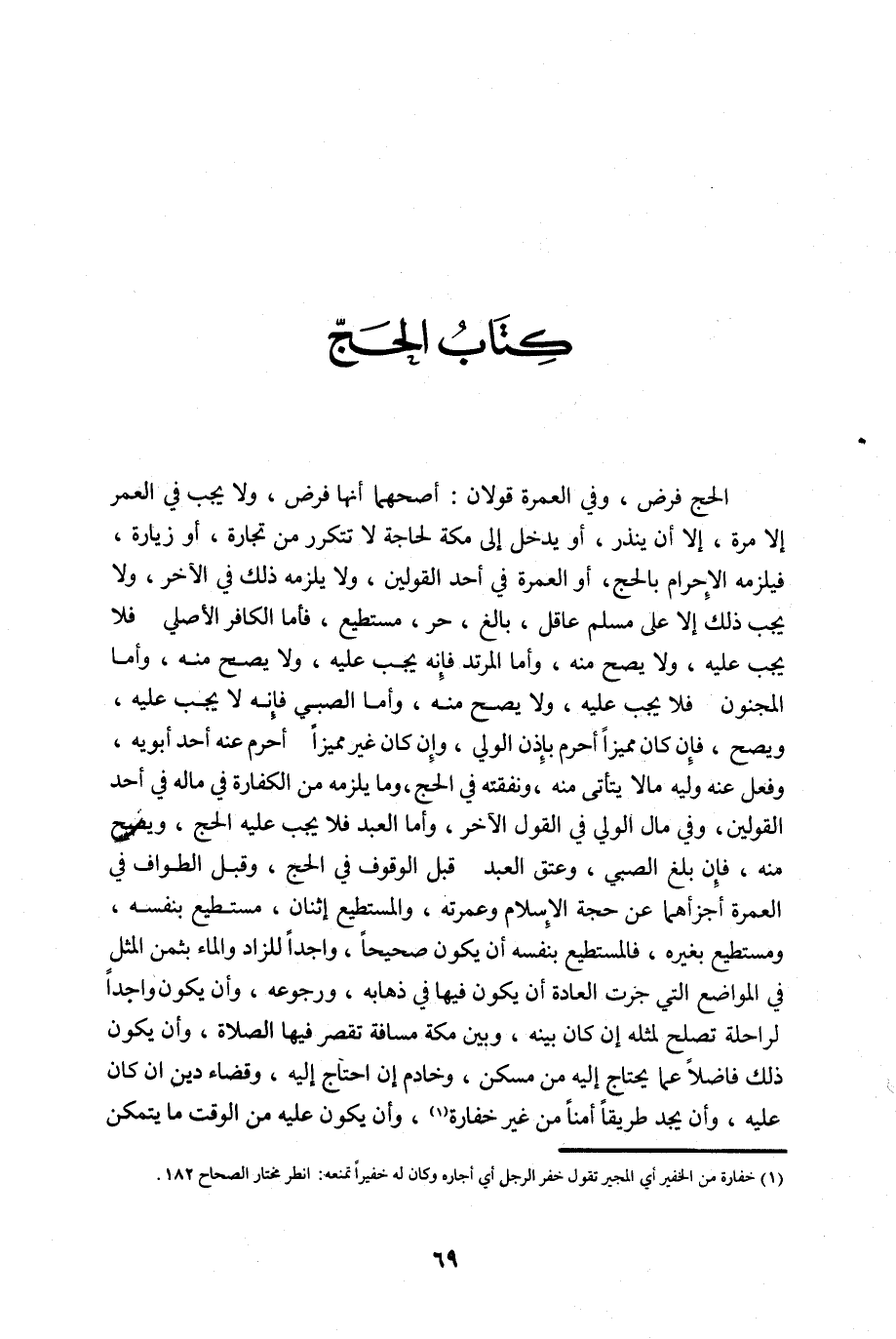 الحج فرض وفي العمرة قولان: أصحهما أنها فرض ولا يجب في العمر الا مرة الا أن ينذر أو يدخل الى مكة لحاجة لا تتكرر من تجارة أو زيارة فيلزمه الاحرام بالحج أو العمرة في أحد القولين ولا يلزمه ذلك في الآخر ولا يجب ذلك الا على مسلم عاقل بالغ حر مستطيع فأما الكافر الأصلي فلا يجب عليه ولا يصح منه وأما المرتد فإنه يجب عليه ولا يصح منه وأما المجنون فلا يجب عليه ولا يصح منه وأما الصبي فإنه لايجب عليه ويصح فإن كان مميزا أحرم بإذن الولي وان كان غير مميزا أحرم عنه أحد أبويه وفعل عنه وليه ما لا يتأتى منه ونفقته في الحج وما يلزمه من الكفارة في ماله في أحد القولين وفي مال الولي في القول الآخر وأما العبد فلا يجب عليه الحج ويصح منه فإن بلغ الصبي وعتق العبد قبل الوقوف في الحج وقبل الطواف في العمرة أجزأها عن حجة الاسلام وعمرته والمستطيع اثنان مستطيع بنفسه ومستطيع بغيره فالمستطيع بنفسه أن يكون صحيحا واجدا للزاد والماء بثمن المثل في المواضع التي جرت العادة أن يكون فيها في ذهابه ورجوعه وأن يكون واجدا لراحلة تصلح لمثله ان كان بينه وبين مكة مسافة تقصر فيها الصلاة وأن يكون ذلك فاضلا عما يحتاج اليه من مسكن وخادم ان احتاج اليه وقضاء دين ان كان عليه وأن يجد طريقا أمنا من غير خفارة1 وأن يكون عليه من الوقت ما يتمكن