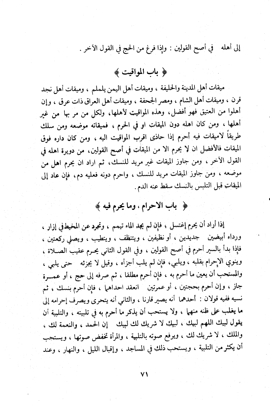 ميقات أهل المدينة والحليفة وميقات أهل اليمن يلملم وميقات أهل نجد قرن وميقات أهل الشام ومصر الجحفة وميقات أهل العراق ذات عرق وان أهلوا من العتيق فهو أفضل وهذه المواقيت لأهلها ولكل من مر بها من غير أهلها ومن كان أهله دون الميقات أو في الحرم فميقاته موضعه ومن سلك طريقا لا ميقات فيه أحرم اذا حاذى أقرب المواقيت اليه, ومن كان داره فوق الميقات, فالأفضل أن لا يحرم الا من الميقات في أصح القولين من دويرة أهله في القول الآخر ومن جاوز الميقات غير مريد للنسك ثم أراد أن يحرم اهل من موضعه ومن جاوز الميقات مريد النسك وأحرم دونه فعليه دم فإن عاد الى الميقات قبل التلبس بالنسك سقط عنه الدم.