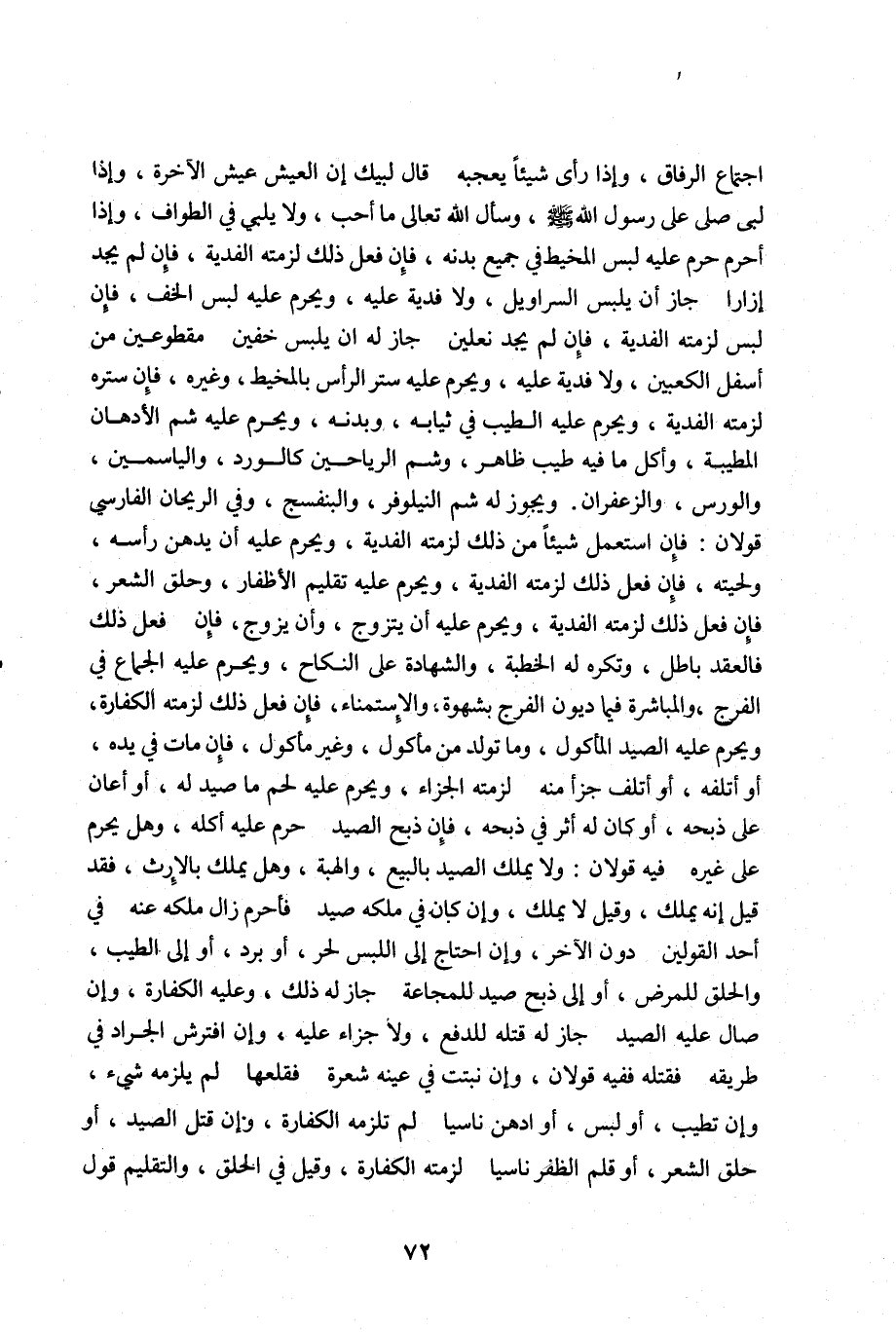 اجتماع الرفاق واذا رأى شيئا يعجبه قال لبيك ان العيش عيش الآخرة واذا لبى صلى على رسول الله صلى اله عليه وسلم وسأل الله تعالى ما أحب ولايلبي في الطواف واذا أحرم حرم عليه لبس المخيط في جميع بدنه فإن فعل ذلك لزمته الفدية فإن لم يجد ازارا جاز أن يلبس السراويل ولا فدية عليه ويحرم عليه لبس الخف فإن لبس لزمته الفدية فإن لم يجد نعلين جاز له أن يلبس خفين مقطوعين من أسفل الكعبين ولا فدية عليه ويحرم عليه ستر الرأس بالمخيط وغيره فإن ستره لزمته الفدية ويحرم عليه الطيب في ثيابه وبدنه ويحرم عليه شم الأدهان المطيبة وأكل ما فيه طيب ظاهر وشم الرياحين كالورد والياسمين والورس والزعفران ويجوز له شم النيلوفر والبنفسج وفي الريحان الفارسي قولان: فإن استعمل شيئا من ذلك لزمته الفدية ويحرم عليه أن يدهن رأسه ولحيته فإن فعل ذلك لزمته الفدية ويحرم عليه تقليم الأظفار وحلق الشعر فإن فعل ذلك لزمته الفدية ويحرم عليه أن يتزوج وأن يزوج فإن فعل ذلك فالعقد باطل وتكره له الخطبة والشهادة على النكاح ويحرم عليه الجماع في الفرج والمباشرة فيما الفرج بشهوة والاستمناء فإن فعل ذلك لزمته الكفارة ويحرم عليه الصيد المأكول وما تولد من مأكول وغير مأكول فإن مات في يده أو أتلفه أو أتلف جزء منه لزمه الجزاء ويحرم عليه لحم ما صيد له أو أعان على ذبحه أو كان له أثر في ذبحه فإن ذبح الصيد حرم عليه أكله وهل يحرم على غيره فيه قولان ولا يملك الصيد بالبيع والهبة وهل يملك بالإرث فقد قيل انه يملك وقيل لا يملك وان كان في ملكه صيد فأحرم زال ملكه عنه في أحد القولين دون الآخر وان احتاج الى اللبس لحر أو برد أو الى الطيب والحلق للمرض أو الى ذبح صيد للمجاعة جاز له ذلك وعليه الكفارة وان صال عليه الصيد جاز له قتله للدفع ولا جزاء عليه وان افترش الجراد في طريقه فقتله ففيه قولان وان نبتت في عينه شعرة فقلعها لم يلزمه شيء وان تطيب أو لبس أو ادهن ناسيا لم تلزمه الكفارة وان قتل الصيد أو حلق الشعر أو قلم الظفر ناسيا لزمته الكفارة وقيل في الحلق والتقليم قول