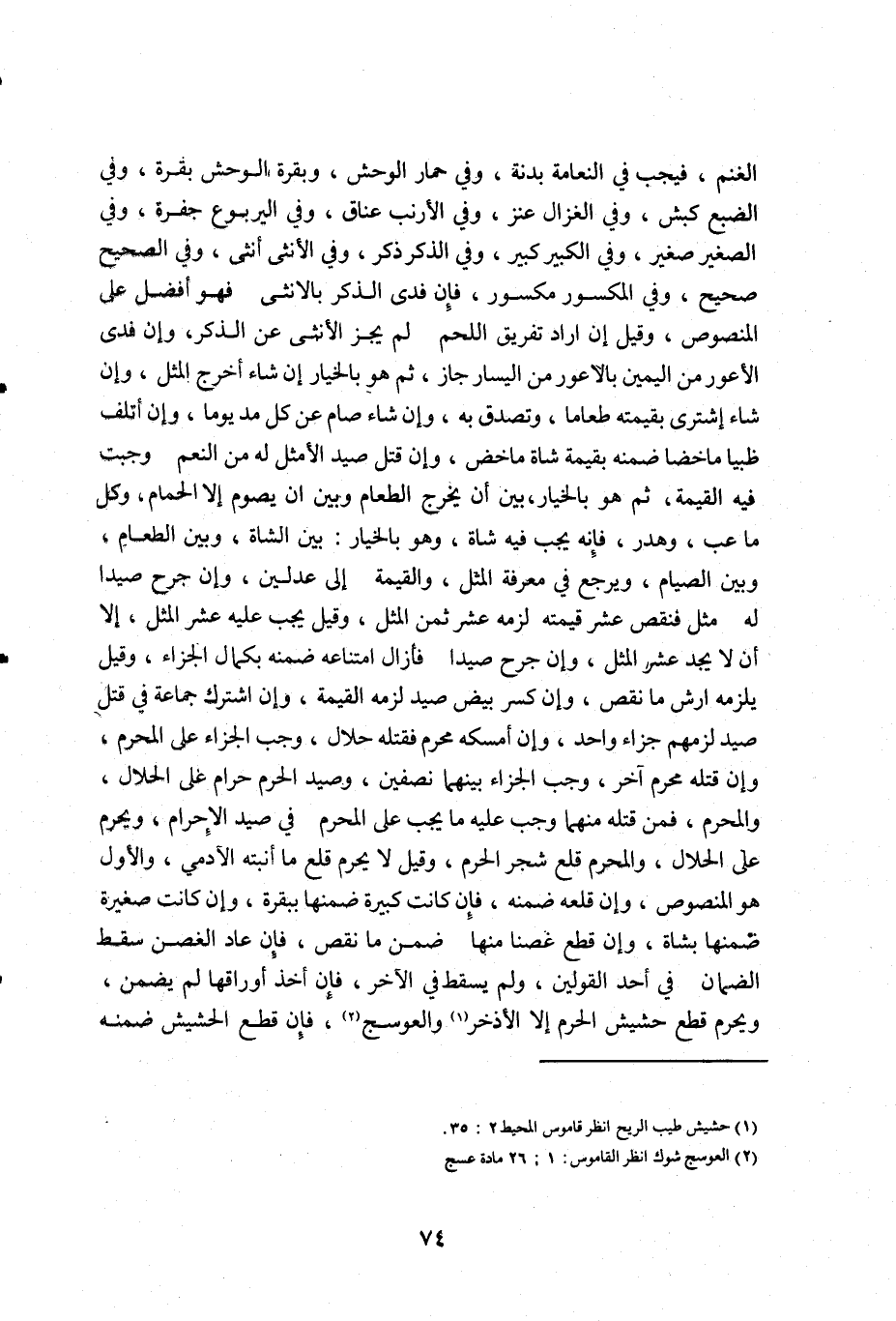 الغنم فيجب في النعامة بدنة وفي حمار الوحش وبقرة الوحش بقرة وفي الضبع كبش وفي الغزال عنز وفي الأرنب عناق وفي اليربوع جفرة وفي الصغير صغير وفي الكبير كبير وفي الذكر ذكر وفي الأنثى أنثى وفي الصحيح صحيح وفي المكسور مكسور فان فدى الذكر بالأنثى فهو أفضل على المنصوص وقيل إن أراد تفريق اللحم لم يجز الأنثى عن الذكر وإن فدى الأعور من اليمين من اليسار جاز ثم هو بالخيار ان شاء أخرج المثل وان شاء اشترى بقيمته طعاما وتصدق به وان شاء صام عن كل مد يوما وان أتلف ظبيا ماخضا ضمنه بقيمة شاة ماخض وان قتل صيد الأمثل له من النعم وجبت في القيمة ثم هو بالخيار بين أن يخرج الطعام وبين أن يصوم الا الحمام وكل ما عب وهدر فإنه يجب فيه شاة وهو بالخيار: بين الشاة وبين الطعام وبين الصيام ويرجع في معرفة المثل والقيمة الى عدلين وان جرح صيدا له مثل فنقص عشر قيمته لزمه عشر ثمن المثل وقيل يجب عليه عشر المثل الا أن لا يجد عشر المثل وان جرح صيدا فأزال امتناعه ضمنه بكمال الجزاء وقيل يلزمه ارش ما نقص وان كسر بيض صيد لزمه القيمة وان اشترك جماعة في قتل صيد لزمهم جزاء واحد وان أمسكه محرم فقتله حلال وجب الجزاء على المحرم وان قتله محرم آخر وجب الجزاء بينهما نصفين وصيد الحرم حرام على الحلال والمحرم فمن قتله منهما وجب عليه ما يجب على المحرم في صيد الاحرام ويحرم على الحلال والمحرم قلع شجر الحرم وقيل لا يحرم قلع ما أنبته الأدمي والأول هو المنصوص وان قلعه ضمنه فإن كانت كبيرة ضمنها ببقرة وان كانت صغيرة ضمنها بشاة وان قطع غصنا منها ضمن ما نقص فإن عاد الغصن سقط الضمان في أحد القولين ولم يسقط في الآخر فإن أخذ أوراقها لم يضمن ويحرم قطع حشيش الحرم الا الأذخر1 والعوسج2 فإن قطع الحشيش ضمنه