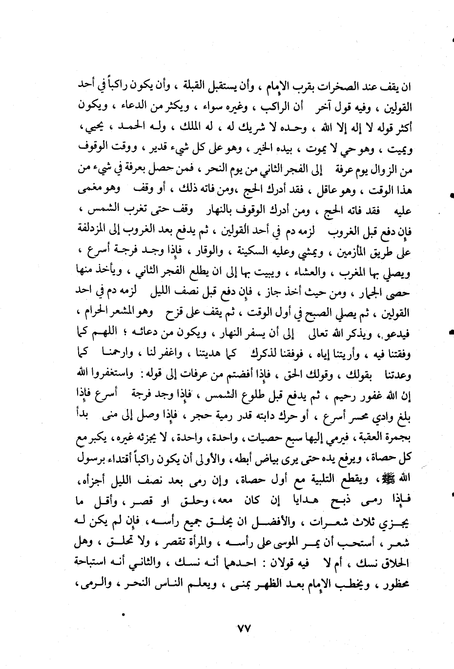 أن يقف عند الصخرات بقرب الامام وأن يستقبل القبلة وأن يكون راكبا في أحد القولين وفيه قول آخر أن الراكب وغيره سواء ويكثر من الدعاء ويكون أكثر قوله لا اله الا الله وحده لا شريك له له الملك وله الحمد يحيي ويميت وهو حي لا يموت بيده الخير وهو على كل شيء قدير ووقت الوقوف من الزوال يوم عرفة الى الفجر الثاني من يوم النحر فمن حصل بعرفة في شيء من هذا الوقت وهو عاقل فقد أدرك الحج ومن فاته ذلك أو وقف وهو مغمى عليه فقد فاته الحج ومن أدرك الوقوف بالنهار وقف حتى تغرب الشمس فإن دفع قبل الغروب لزمه دم في أحد القولين ثم يدفع بعد الغروب الى المزدلفة على طريق المأزمين ويمشي وعليه السكينة والوقار فإذا وجد فرجة أسرع ويصلي بها المغرب والعشاء ويبيت بها الى أن يطلع الفجر الثاني ويأخذ منها حصى الجمار ومن حيث أخذ جاز فإن دفع قبل نصف الليل لزمه دم في أحد القولين ثم يصلي الصبح في أول الوقت ثم يقف على قزح وهو المشعر الحرام فيدعو ويذكر الله تعالى الى أن يسفر النهار ويكون من دعائه اللهم كما وفقتنا فيه وأريتنا اياه فوفقنا لذكرك كما هديتنا واغفر لنا وارحمنا كما وعدتنا بقولك وقولك الحق فإذا أفضتم من عرفات الى قوله: واستغفروا الله إن الله غفور رحيم ثم يدفع قبل طلوع الشمس فإذا وجد فرجة أسرع فإذا بلغ وادي محسر أسرع أو حرك دابته قدر رمية حجر فإذا وصل الى منى بدأ بجمرة العقبة فيرمي اليها سبع حصيات واحدة واحدة لا يجزئه غيره يكبر مع كل حصاة ويرفع يده حتى يرى بياض أبطه والأولى أن يكون راكبا اقتداء برسول الله صلى اللهعليه وسلم ويقطع التلبية مع أول حصاة وان رمى بعد نصف الليل أجزأه فإذا رمى ذبح هدايا ان كان معه وحلق أو قصر وأقل ما يجزي ثلاث شعرات والأفضل أن يحلق جميع رأسه فإن لم يكن له شعر استحب أن يمر الموسى على رأسه والمرأة تقصر ولا تحلق وهل الحلاق نسك أم لا فيه قولان: أحدهما أنه نسك والثاني أنه استباحة محظور ويخطب الامام بعد الظهر بمنى ويعلم الناس النحر والرمي,