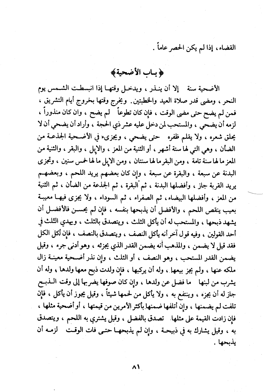 الأضحية سنة الا أن ينذر ويدخل وقتها اذا انبسطت الشمس يوم النحر ومضى قدر صلاة العيد والخطبتين ويخرج وقتها بخروج أيام التشريق فمن لم يضح حتى مضى الوقت فإن كان تطوعا لم يضح وان كان منذورا لزمه أن يضحي والمستحب لمن دخل عليه عشر ذي الحجة وأراد أن يضحي أن لا يحلق شعره ولا يقلم ظفره حتى يضحي ويجزىء في الأضحية الجذعة من الضأن وهي التي لها ستة أشهر أو الثنية من المعز والابل والبقر والثنية من المعز ما لها سنة تامة ومن البقر ما لها سنتان ومن الابل ما لها خمس سنين وتجزى البدنة عن سبعة والبقرة عن سبعة وان كان بعضهم يريد اللحم وبعضهم يريد القربة جاز وأفضلها البدنة ثم البقرة ثم الجذعة من الضأن ثم الثنية من المعز وأفضلها البيضاء ثم الصفراء ثم السوداء ولا يجزي فيها معيبة بعيب ينقص اللحم والأفضل أن يذبحها بنفسه فإن لم يحسن فالأفضل أن يشهد ذبحها والمستحب له أن يأكل الثلث ويتصدق بالثلث ويهدي الثلث في أحد القولين وفيه قول آخر أنه يأكل النصف ويتصدق بالنصف فإن أكل الكل فقد قيل لا يضمن والمذهب أنه يضمن القدر الذي يجزئه وهو أدنى جزء وقيل يضمن القدر المستحب وهو النصف أو الثلث وان نذر أضحية معينة زال ملكه عنها ولم يجز بيعها وله أن يركبها فإن ولدت ذبح معها ولدها وله أن يشرب من لبنها ما فضل عن ولدها وان كان صوفها يضربها الى وقت الذبح جاز له أن يجزه وينتفع به ولا يأكل من لحمها شيئا وقيل يجوز أن يأكل فإن تلفت لم يضمنها وان أتلفها ضمنها بأكثر الأمرين من قيمتها أو أضحية مثلها فإن زادت القيمة على مثلها تصدق بالفضل وقيل يشتري به اللحم ويتصدق به وقيل يشارك به في ذبيحة وان لم يذبحها حتى فات الوقت لزمه أن يذبحها.