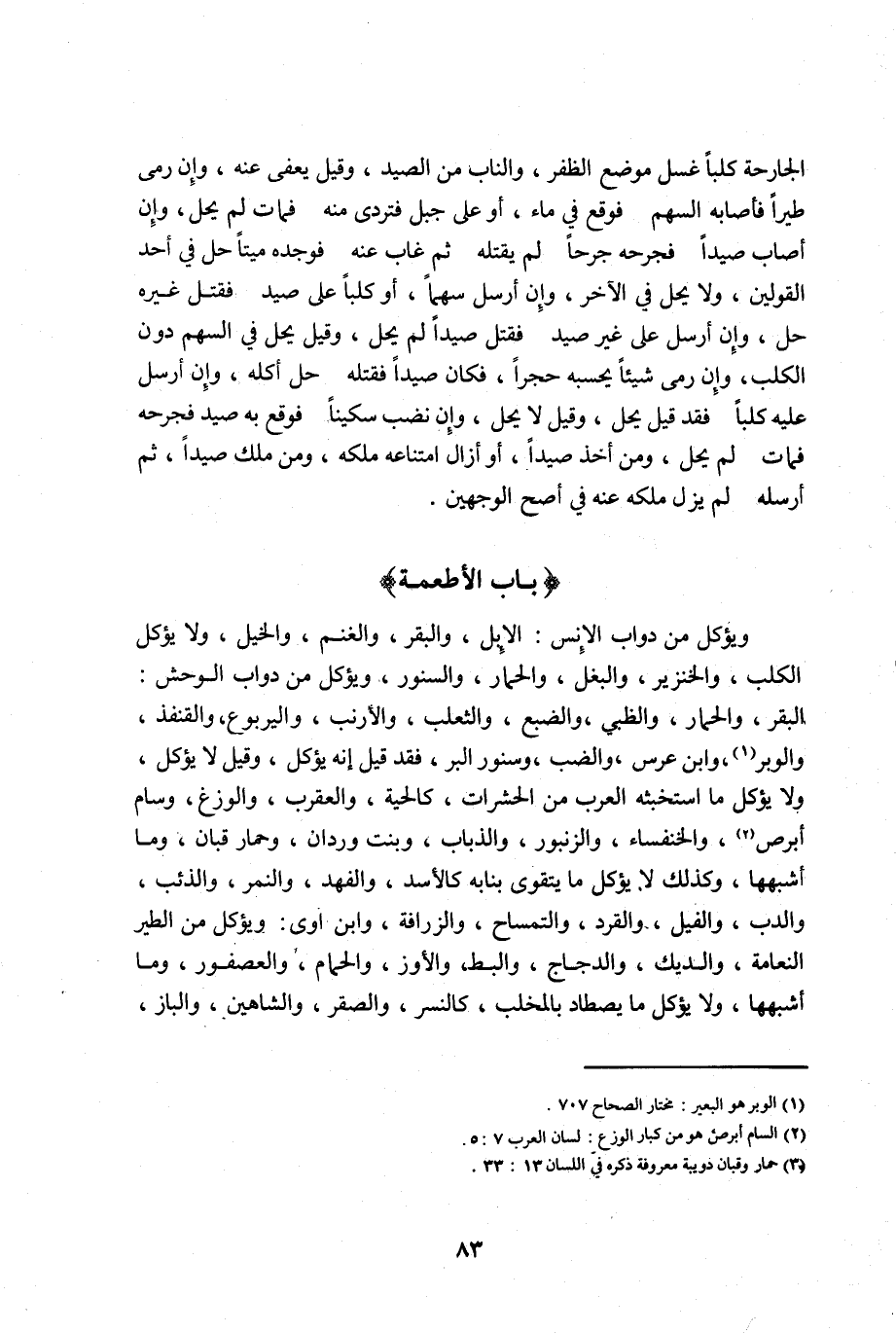 ويؤكل من دواب الانس: الابل والبقر والغنم والخيل ولا يؤكل الكلب والخنزير والبغل والحمار والسنور ويؤكل من دواب الوحش: البقر والحمار والظبي والضبع والثعلب والأرنب واليربوع والقنفذ والوبر1 وابن عرس والضب وسنور البر فقد قيل انه يؤكل وقيل لا يؤكل ولا يؤكل ما استخبثه العرب من الحشرات كالحية والعقرب والوزغ وسام أبرص2 والخنفساء والزنبور والذباب وبنت وردان وحمار قبان3 وما أشبهها وكذلك لا يؤكل ما يتقوى بنابه كالأسد والفهد والنمر والذئب والدب والفيل والقرد والتمساح والزرافة وابن أوى: ويؤكل من الطير النعامة والديك والدجاج والبط والأوز والحمام والعصفور وما أشبهها ولا يؤكل ما يصطاد بالمخلب كالنسر والصقر والشاهين والباز