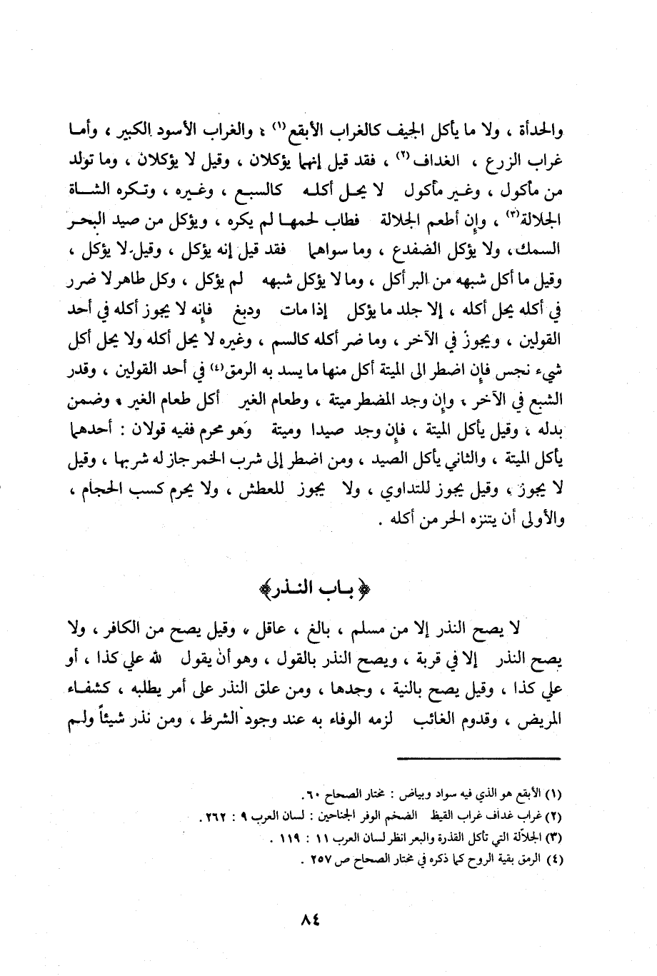 والحدأة ولا ما يأكل الجيف كالغراب الأبقع1 والغراب الأسود الكبير وأما غراب الزرع الغداف2 فقد قيل انهما يؤكلان وقيل لا يؤكلان وما تولد من مأكول وغير مأكول لا يحل أكله كالسبع وغيره وتكره الشاة الجلالة3 وان أطعم الجلالة فطاب لحمها لم يكره ويؤكل من صيد البحر السمك ولا يؤكل الضفدع وما سواهما فقد قيل انه يؤكل وقيل لا يؤكل وقيل ما أكل شبهه من البر أكل ومالا يؤكل شبهه لم يؤكل وكل طاهر لا ضرر في أكله يحل أكله الا جلد ما يؤكل اذا مات ودبغ فإنه لا يجوز أكله في أحد القولين ويجوز في الآخر وما ضر أكله كالسم وغيره لا يحل اكله ولا يحل أكل شيء نجس فان اضطر الى الميتة أكل منها ما يسد به الرمق4 في أحد القولين وقدر الشبع في الآخر وان وجد المضطر ميتة وطعام الغير أكل طعام الغير وضمن بدله وقيل يأكل الميتة فإن وجد صيدا وميتة وهو محرم ففيه قولان: أحدهما يأكل الميتة والثاني يأكل الصيد ومن اضطر الى شرب الخمر جاز له شربها وقيل يجوز للتداوي ولا يجوز للعطش ولا يحرم كسب الحجام والأولى أن يتنزه الحر من أكله.