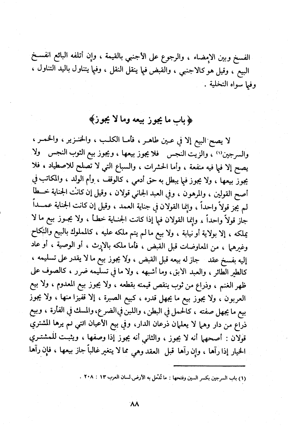 لا يصح البيع الا في عين طاهر فأما الكلب والخنزير والخمر والسرجين1 والزيت النجس فلا يجوز بيعها ويجوز بيع الثوب النجس ولا يصح الا فيما فيه منفعة وأما الحشرات والسباع التي لا تصلح للاصطياد فلا يجوز بيعها ولا يجوز فيما يبطل به حق آدمي كالوقف وأم الولد والمكاتب في أصح القولين والمرهون وفي العبد الجاني قولان وقيل ان كانت الجناية خطأ لم يجز قولا واحدا وانما القولان في جناية العمد وقيل ان كانت الجناية عمدا جاز قولا واحدا وانما القولان فيما اذا كانت الجناية خطأ ولا يجوز بيع ما لا يملكه الا بولاية أو نيابة ولا بيع ما لم يتم ملكه عليه كالمملوك بالبيع والنكاح وغيرهما من المعاوضات قبل القبض فأما ملكه بالارث أو الوصية أو عاد اليه بفسخ عقد جاز له بيعه قبل القبض ولا يجوز بيع ما لا يقدر على تسليمه كالطير الطائر والعبد الآبق وما أشبهه ولا ما في تسليمه ضرر كالصوف على ظهر الغنم وذراع من ثوب ينقص قيمته بقطعة ولا يجوز بيع المعدوم ولا بيع العربون ولا يجوز بيع ما يجهل قدره كبيع الصبرة الا قفيزا منها ولا يجوز بيع ما يجهل صفته كالحمل في البطن واللبن في الضرع والمسك في الفأرة وبيع ذراع من دار وهما لا يعلمان ذرعان الدار وفي بيع الأعيان التي لم يرها المشتري قولان: أصحهما أنه لا يجوز والثاني أنه يجوز اذا وصفها ويثبت للمشتري الخيار اذا رآها وان رآها قبل العقد وهي مما لا يتغير غالبا جاز بيعها فإن رآها