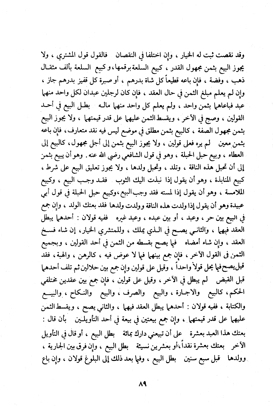 وقد نقصت ثبت له الخيار وان اختلفا في النقصان فالقول قول المشتري ولا يجوز البيع بثمن مجهول القدر كبيع السلعة برقمها وكبيع السلعة بألف مثقال ذهب وفضة فإن باعه قطيعا كل شاة بدرهم أو صبرة كل قفيز بدرهم جاز وان لم يعلم مبلغ الثمن في حال العقد فإن كان لرجلين عبدان لكل واحد منهما عبد فباعاهما بثمن واحد ولم يعلم كل واحد منهما ماله بطل البيع في أحد القولين وصح في الآخر ويقسط الثمن عليهما على قدر قيمتهما ولا يجوز البيع بثمن مجهول الصفة كالبيع بثمن مطلق في موضع ليس فيه نقد متعارف فإن باعه بثمن معين لم يره فعلى قولين ولا يجوز البيع بثمن الى أجل مجهول كالبيع الى العطاء وبيع حبل الحبلة وهو في قول الشافعي رضي الله عنه وهو أن يبيع بثمن الى أن تحبل هذه الناقة وتلد وتحبل ولدها ولا يجوز تعليق البيع على شرط كبيع المنابذة وهو أن يقول اذا نبذت اليك الثوب فقد وجب البيع وكبيع الملامسة وهو أن يقول اذا لمسته فقد وجب البيع وكبيع حبل الحبلة في قول أبي عبيدة وهو أن يقول اذا ولدت هذه الناقة وولدت ولدها فقد بعتك الولد وان جمع في البيع بين حر وعبد أو بين عبده وعبد غيره ففيه قولان: أحدهما يبطل العقد فيهما والثاني يصح في الذي يملك وللمشتري الخيار ان شاء فسخ العقد وان شاء أمضاه فيما يصح بقسطه من الثمن في أحد القولين وبجميع الثمن في القول الآخر فإن جمع بينهما فيما لا عوض فيه كالرهن والهبة فقد قيل يصح فيما يحل قولا واحدا وقيل على قولين وان جمع بين حلالين ثم تلف أحدهما قبل القبض لم يبطل في الآخر وقيل على قولين فإن جمع بين عقدين مختلفي الحكم كالبيع والإجارة والبيع والصرف والبيع والنكاح والبيع والكتابة ففيه قولان: أحدهما يبطل العقد فيهما والثاني يصح ويقسط الثمن عليهما على قدر قيمتهما وان جمع بيعتين في بيعة في أحد التأويلين بأن: قال بعتك هذا العبد بعشرة على أن تبيعني دارك بمائة بطل البيع أو قال في التأويل الآخر بعتك بعشرة نقدا أو بعشرين نسيئة بطل البيع وان فرق بين الجارية وولدها قبل سبع سنين بطل البيع وفيما بعد ذلك الى البلوغ قولان وان باع.