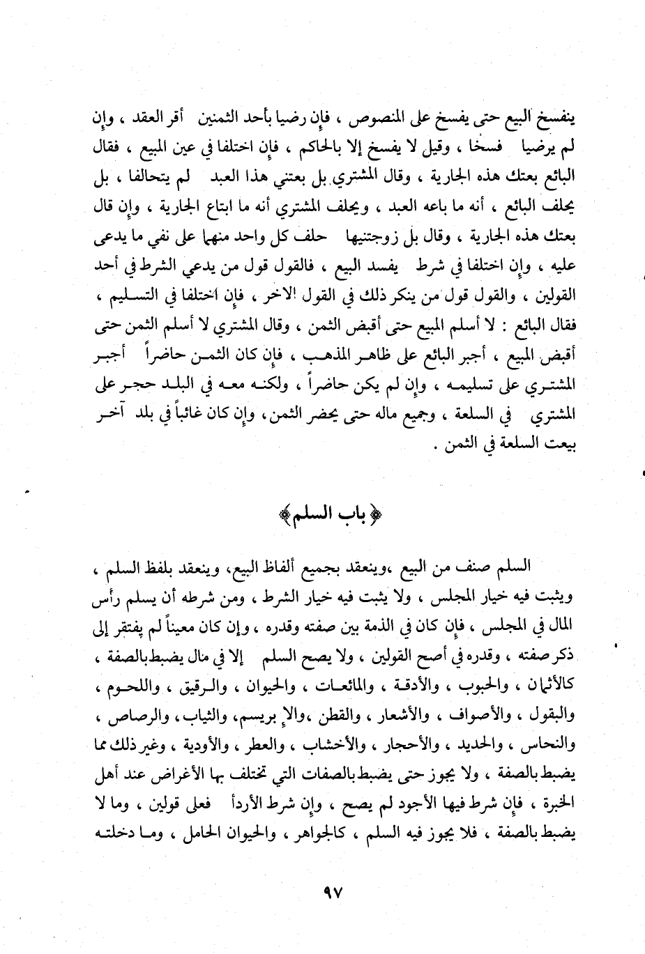 السلم صنف من البيع وينعقد بجميع ألفاظ البيع وينعقد بلفظ السلم ويثبت فيه خيار المجلس ولا يثبت فيه خيار الشرط ومن شرطه أن يسلم رأس المال في المجلس فان كان في الذمة بين صفته وقدره وان كان معينا لم يفتقر الى ذكر صفته وقدره في أصح القولين ولا يصح السلم الا في مال يضبط بالصفة كالأثمان والحبوب والأدقة والمائعات والحيوان والرقيق واللحوم والبقول والأصواف والأشعار والقطن والابريسم والثياب والرصاص والنحاس والحديد والأحجار والأخشاب والعطر والأدوية وغير ذلك مما يضبط بالصفة ولا يجوز حتى يضبط بالصفات التي تختلف بها الأغراض عند أهل الخبرة فإن شرط فيها الأجود لم يصح وان شرط الأردأ فعلى قولين وما لا يضبط بالصفة فلا يجوز فيه السلم كالجواهر والحيوان الحامل وما دخلته
