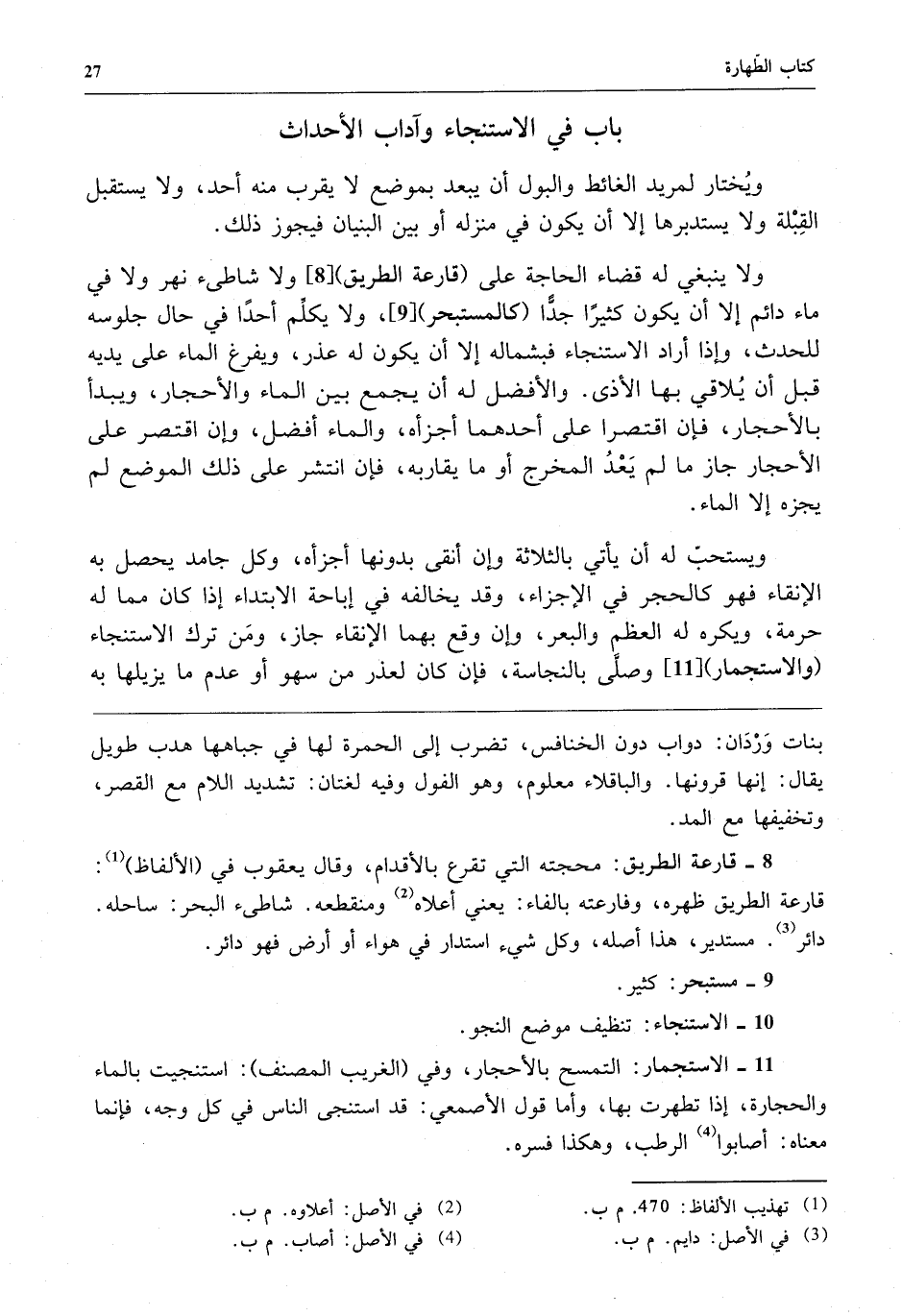 ولا ينبغي له قضاء الحاجة على "قارعة الطريق" ولا شاطئ نهر ولا في ماء دائم إلا أن يكون كثيراً جداً "كالمستبحر" ولا يكلم أحداً في حال جلوسه للحدث وإذا أراد الاستنجاء فبشماله إلا أن يكون له عذر ويفرغ الماء على يديه قبل أن يلاقي بها الأذى والأفضل له أن يجمع بين الماء والأحجار ويبدأ بالأحجار فإن اقتصر على أحدهما أجزأه والماء أفضل وإن اقتصر على الأحجار جاز ما لم يعد المخرج أو ما يقاربه فإن انتشر على ذلك الموضع لم يجزه إلا الماء.