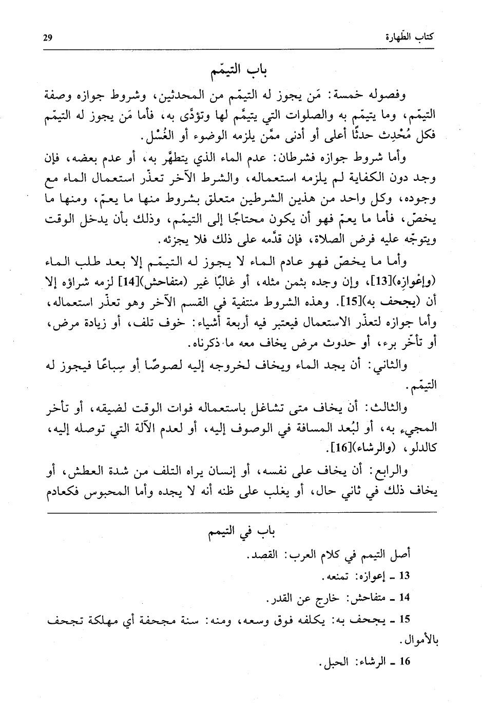 وأما ما يخص فهو عادم الماء لا يجوز له التيمم إلا بعد طلب الماء "واعوازه" وإن وجده بثمن مثله أو غالباً غير "متفاحش" لزمه شراؤه إلا أن "يجحف به" وهذه الشروط منتفية في القسم الآخر وهو تعذر استعماله وأما جوازه لتعذر الاستعمال فيعتبر فيه أربعة شياء خوف تلف أو زيادة مرض أو تأخر برء أو حدوث مرض يخاف معه ما ذكرناه.