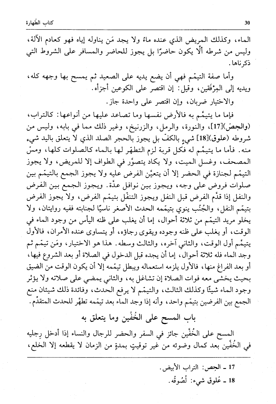 المسح على الخفين جائز في السفر والحضر للرجال والنساء إذا أدخل رجليه في الخفين بعد كمال وضوئه من غير توقيت بمدة من الزمان لا يقطعه إلا الخلع,