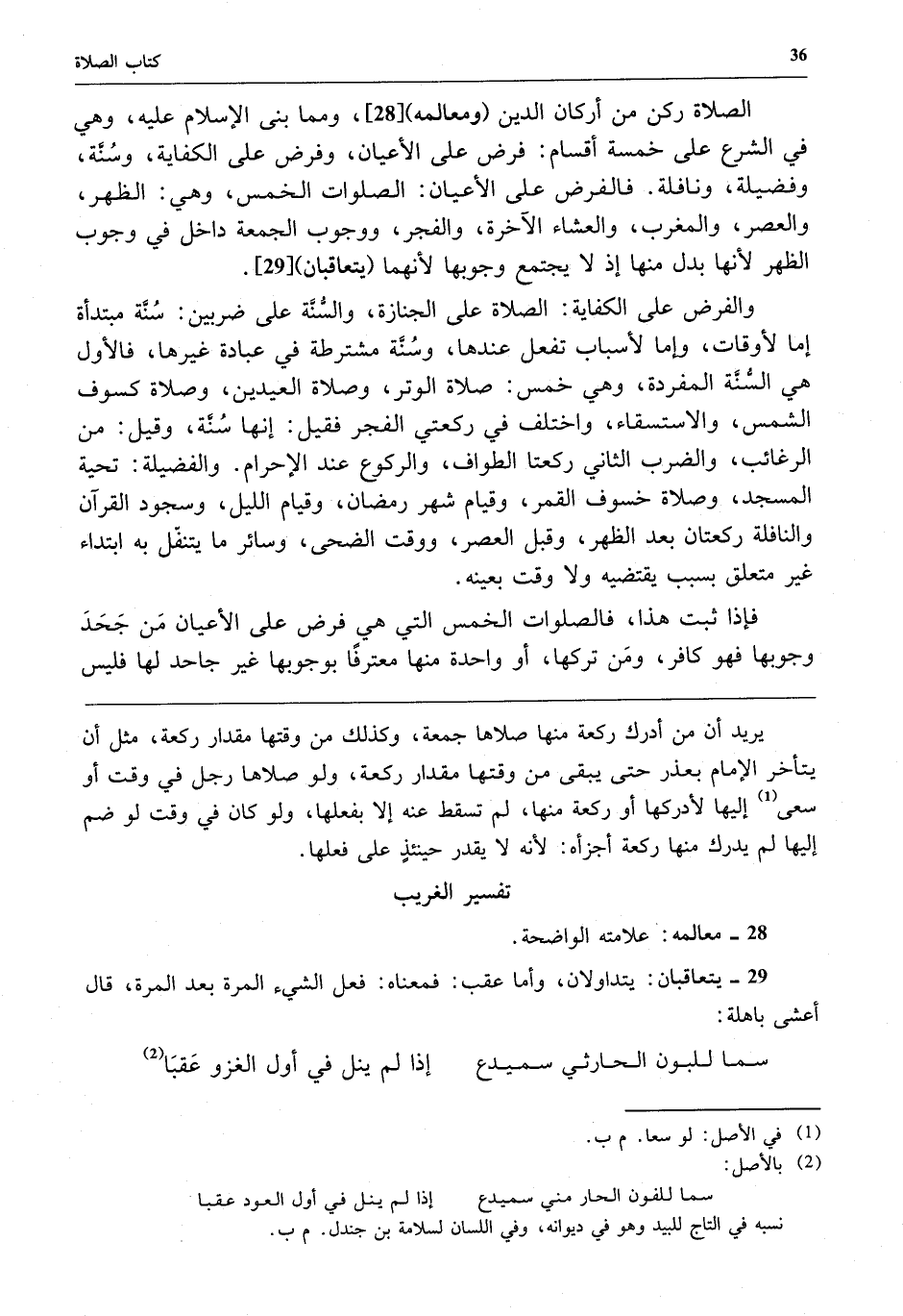 الصلاة ركن من أركان الدين ومعالمه ومما بني الإسلام عليه وهي في الشرع على خمسة أقسام فرض على الأعيان وفرض على الكفاية وسنة وفضيلة ونافلة فالفرض على الأعيان الصلوات الخمس وهي الظهر والعصر والمغرب والعشاء الآخرة والفجر ووجوب الجمعة داخل في وجوب الظهر لأنها بدل منها إذ لا يجتمع وجوبهما لأنهما يتعاقبان.