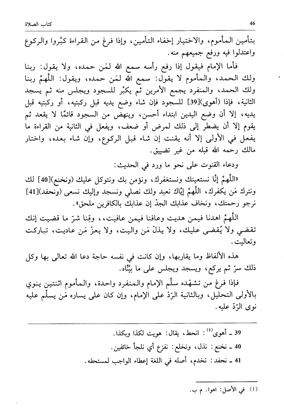 فأما الإمام فيقول إذا رفع رأسه سمع الله لمن حمده ولا يقول ربنا ولك الحمد والمأموم لا يقول سمع الله لمن حمده ويقول اللهم ربنا ولك الحمد والمنفرد يجمع الأمرين ثم يكبر للسجود ويجلس منه ثم يسجد الثانية فإذا هوى للسجود فإن شاء وضع يديه قبل ركبتيه أو ركبتيه قبل يديه إلا أن وضع اليدين ابتداء أحسن وينهض من السجود قائماً لا يقعد ثم يقوم إلا أن يضطر إلى ذلك لمرض أو ضعف ويفعل في الثانية من القراءة ما يفعل في الأولى إلا أنه يقنت إن شاء قبل الركوع وإن شاء بعده واختار مالك رحمه الله قبله من غير تضييق.