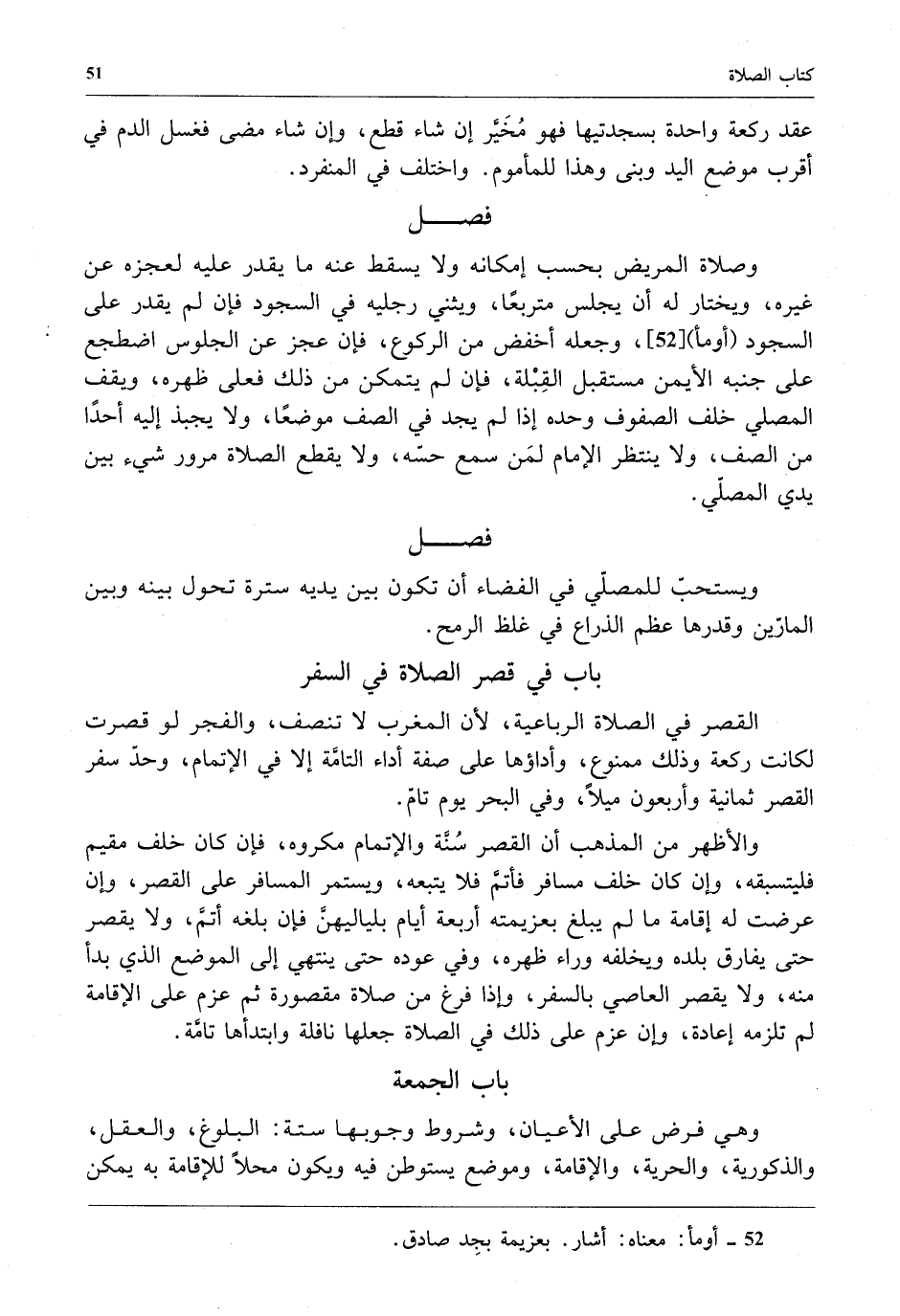 القصر في الصلاة الرباعية، لأن المغرب لا تنصف والفجر لو قصرت لكانت ركعة وذلك ممنوع وأداؤها على صفة أداء التامة إلا في الإتمام وحد سفر القصر ثمانية وأربعون ميلاً وفي البحر يوم تام.