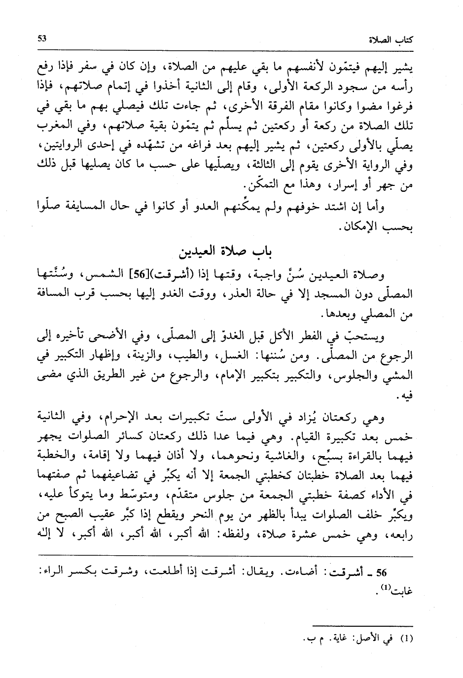 وصلاة العيدين سنة واجبة وقتها إذا أشرقت الشمس وسنتها المصلى دون المسجد إلا في حالة العذر ووقت الغدو إليها بحسب قرب المسافة من المصلي وبعدها.