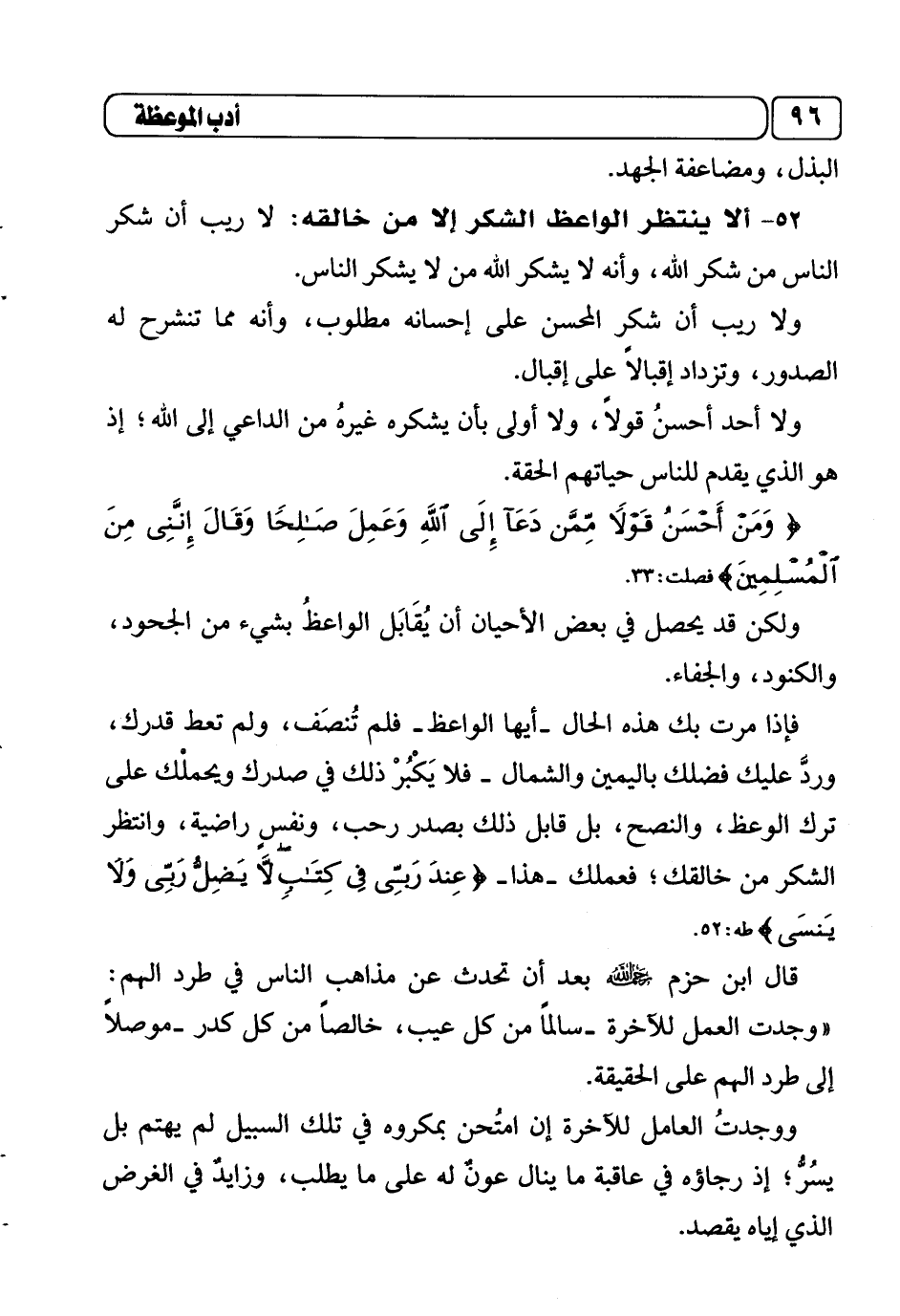 52ـ ألا ينتظر الوعظ الشكر إلا من خالقه: لا ريب أن شكر الناس من شكر الله، وأنه لا يشكر الله من لا يشكر الناس.