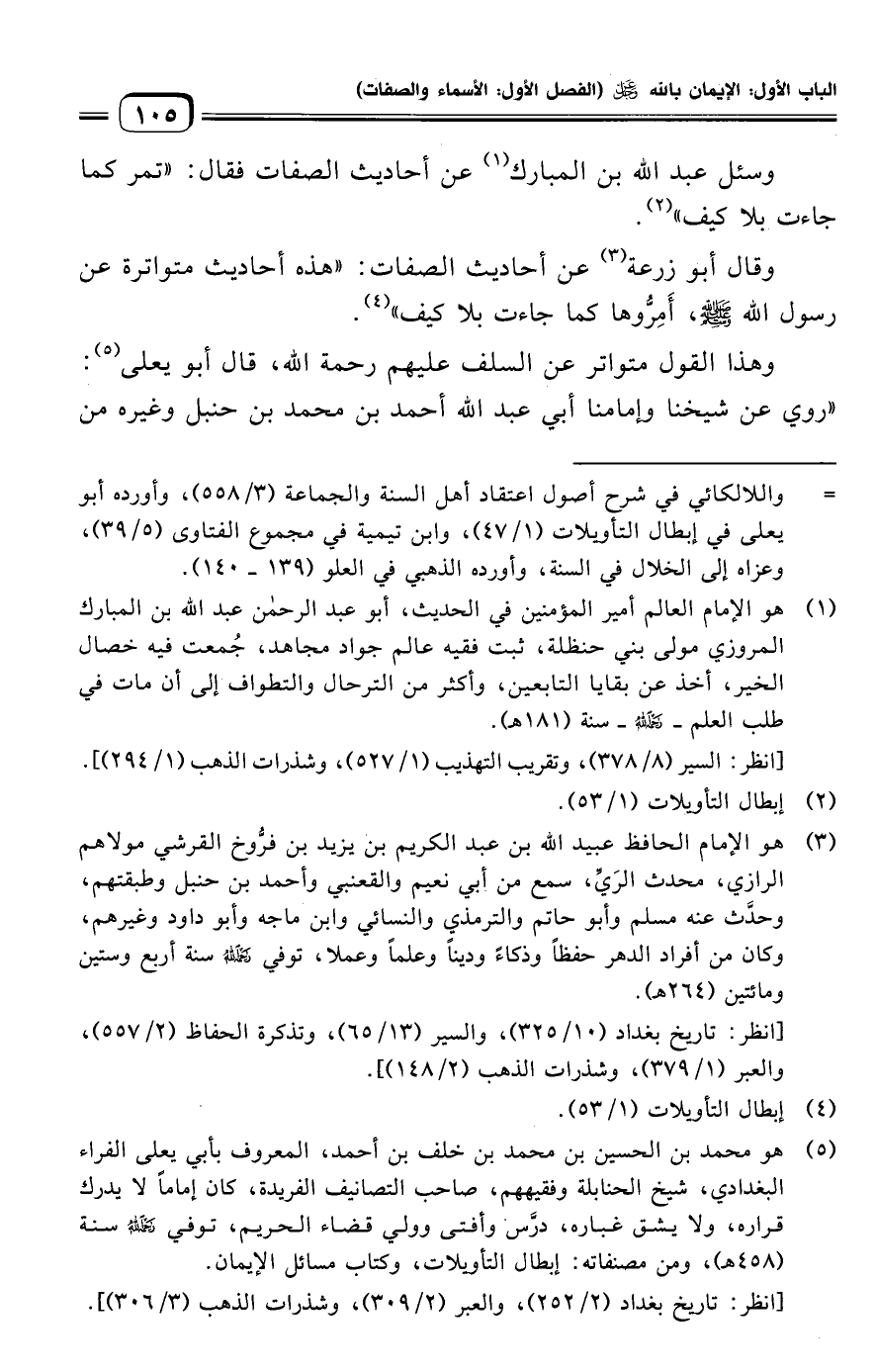 (¬٥) هو محمد بن الحسين بن محمد بن خلف بن أحمد، المعروف بأبي يعلى الفراء البغدادي، شيخ الحنابلة وفقيههم، صاحب التصانيف الفريدة، كان إمامًا لا يدرك قراره، ولا يشق غباره، درَّس وأفتى وولي قضاء الحريم، توفي رحمه الله سنة (٤٥٨ هـ)، ومن مصنفاته: إبطال التأويلات، وكتاب مسائل الإيمان. [انظر: تاريخ بغداد (٢/ ٢٥٢)، والعبر (٢/ ٣٠٩)، وشذرات الذهب (٣/ ٣٠٦)].