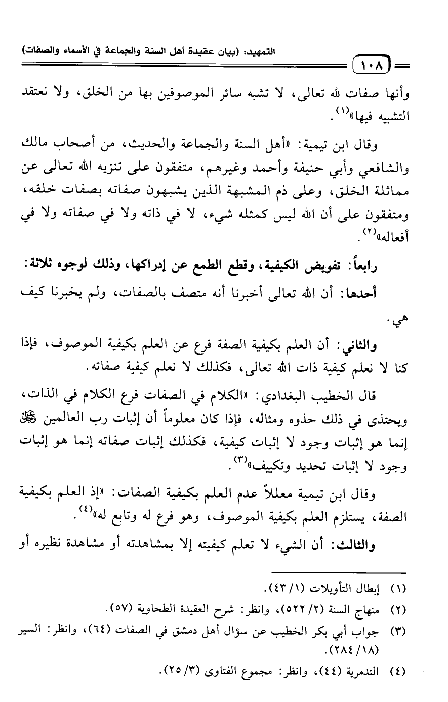 وقال ابن تيمية معللًا عدم العلم بكيفية الصفات: "إذ العلم بكيفية الصفة، يستلزم العلم بكيفية الموصوف، وهو فرع له وتابع له" (¬٤).