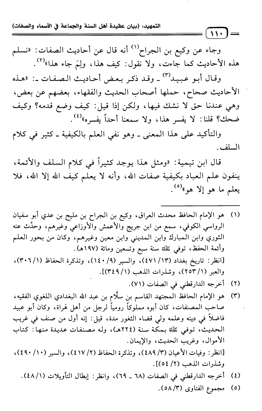 وجاء عن وكيع بن الجراح (¬١) أنه قال عن أحاديث الصفات: "نسلم هذه الأحاديث كما جاءت، ولا نقول: كيف هذا، ولِمَ جاء هذا" (¬٢).