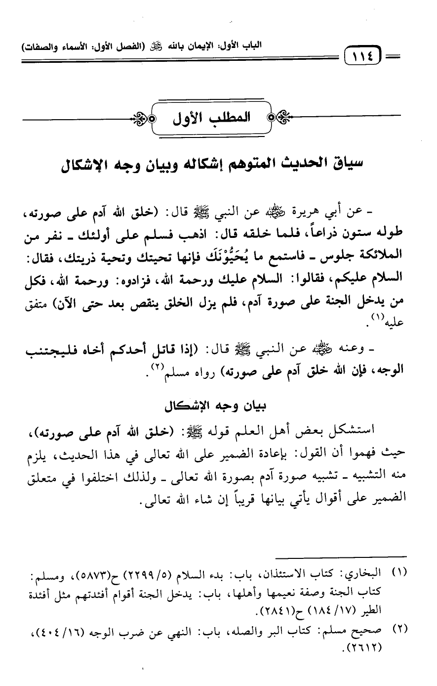 استشكل بعض أهل العلم قوله -صلى الله عليه وسلم-: (خلق الله آدم على صورته)، حيث فهموا أن القول: بإعادة الضمير على الله تعالى في هذا الحديث، يلزم منه التشبيه -تشبيه صورة آدم بصورة الله تعالى- ولذلك اختلفوا في متعلق الضمير على أقوال يأتي بيانها قريبًا إن شاء الله تعالى.