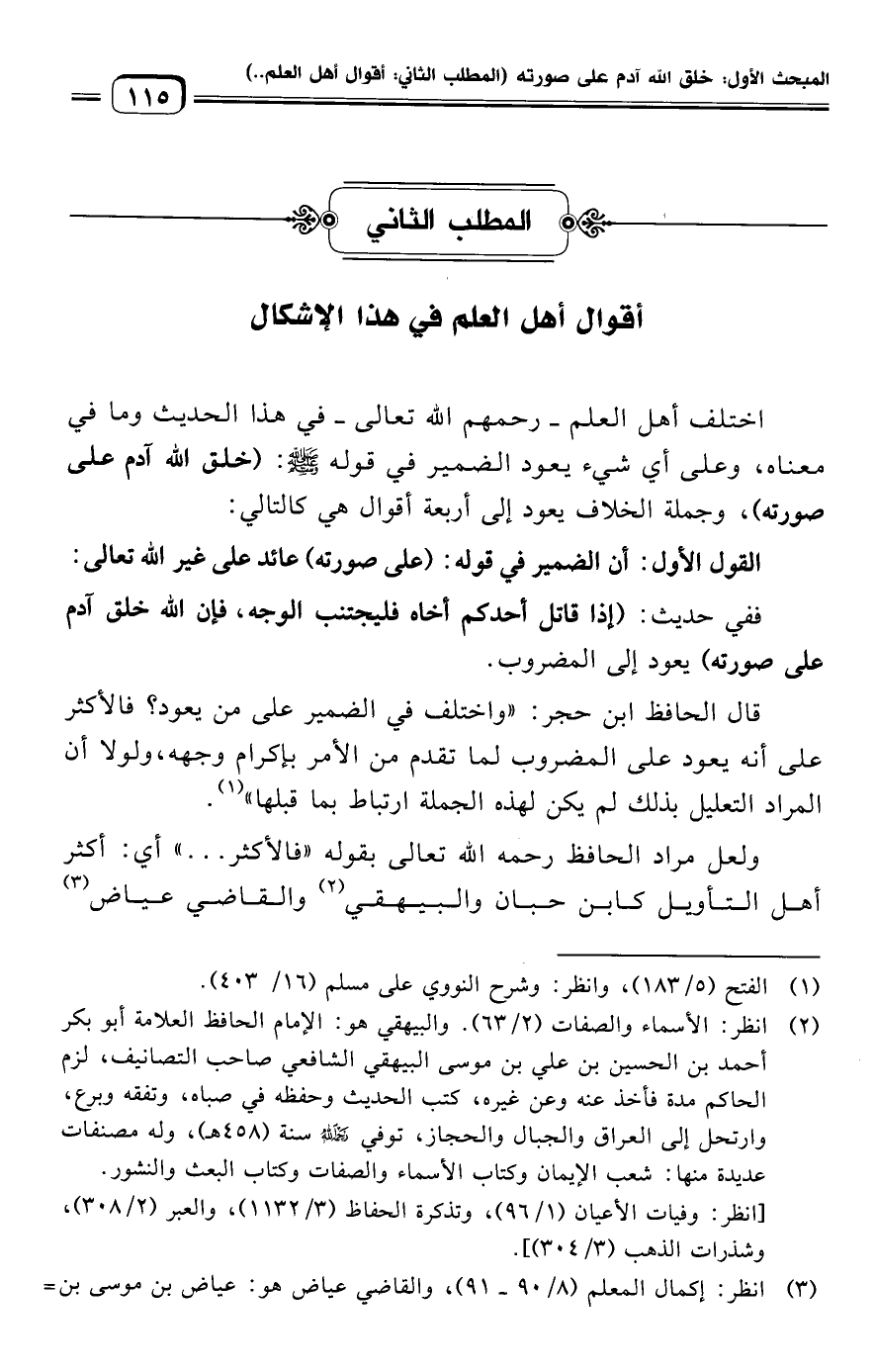 اختلف أهل العلم -رحمهم الله تعالى- في هذا الحديث وما في معناه، وعلى أي شيء يعود الضمير في قوله -صلى الله عليه وسلم-: (خلق الله آدم على صورته)، وجملة الخلاف يعود إلى أربعة أقوال هي كالتالي: