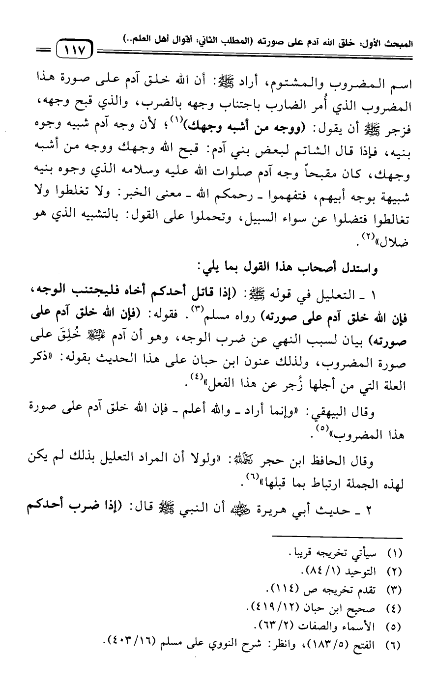 اسم المضروب والمشتوم، أراد -صلى الله عليه وسلم-: أن الله خلق آدم على صورة هذا المضروب الذي أُمر الضارب باجتناب وجهه بالضرب، والذي قبح وجهه، فزجر -صلى الله عليه وسلم- أن يقول: (ووجه من أشبه وجهك) (¬١)؛ لأن وجه آدم شبيه وجوه بنيه، فإذا قال الشاتم لبعض بني آدم: قبح الله وجهك ووجه من أشبه وجهك، كان مقبحًا وجه آدم صلوات الله عليه وسلامه الذي وجوه بنيه شبيهة بوجه أبيهم، فتفهموا -رحمكم الله- معنى الخبر: ولا تغلطوا ولا تغالطوا فتضلوا عن سواء السبيل، وتحملوا على القول: بالتشبيه الذي هو ضلال" (¬٢).
