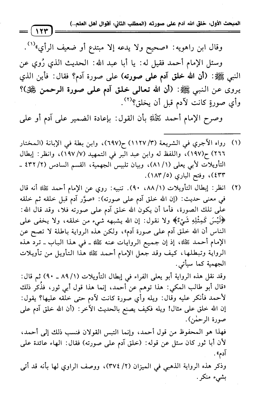 (¬٢) انظر: إبطال التأويلات (١/ ٨٨، ٩٠). تنبيه: روي عن الإمام أحمد رحمه الله أنه قال في معنى حديث: (إن الله خلق آدم على صورته): "صوَّر آدم قبل خلقه ثم خلقه على تلك الصورة، فأما أن يكون الله خلق آدم على صورته فلا، وقد قال الله: {لَيْسَ كَمِثْلِهِ شَيْءٌ} ولا نقول: إن الله يشبهه شيء من خلقه، ولا يخفى على الناس أن الله خلق آدم على صورة آدم"، ولكن هذه الرواية باطلة لا تصح عن الإمام أحمد رحمه الله، إذ إن جميع الروايات عنه رحمه الله -في هذا الباب- ترد هذه الرواية وتبطلها، كيف وقد جعل الإمام أحمد رحمه الله هذا التأويل من تأويلات الجهمية كما سيأتي.