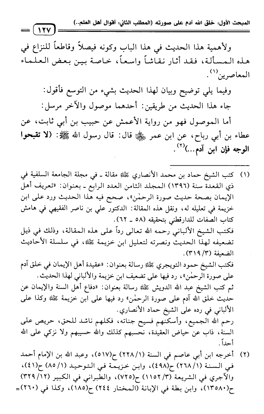 (¬١) كتب الشيخ حماد بن محمد الأنصاري رحمه الله مقالة -في مجلة الجامعة السلفية في ذي القعدة سنة (١٣٩٦) المجلد الثامن العدد الرابع- بعنوان: "تعريف أهل الإيمان بصحة حديث صورة الرحمن"، صحح فيه هذا الحديث ورد على ابن خزيمة في تعليله له، ونقل هذه المقالة: الدكتور علي بن ناصر الفقيهي في هامش كتاب الصفات للدارقطني بتحقيقه (٥٨ - ٦٢).