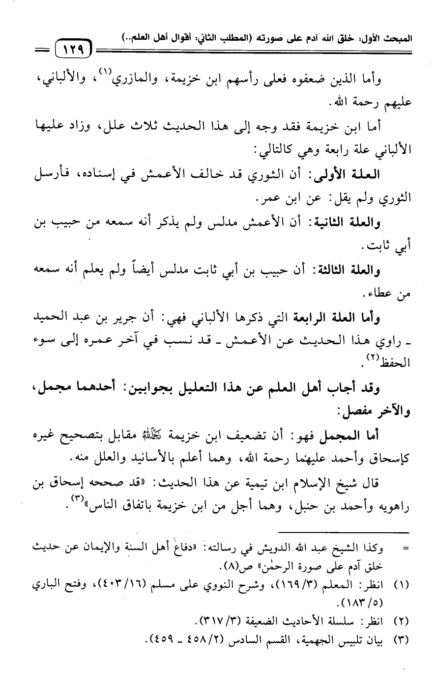 = وكذا الشيخ عبد الله الدويش في رسالته: "دفاع أهل السنة والإيمان عن حديث خلق آدم على صورة الرحمن" ص (٨).