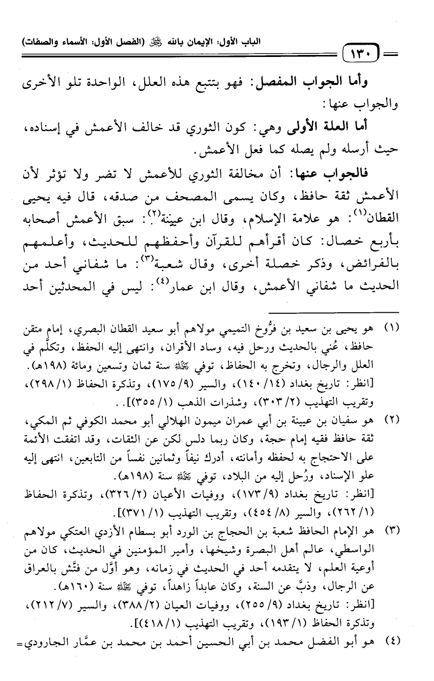 فالجواب عنها: أن مخالفة الثوري للأعمش لا تضر ولا تؤثر لأن الأعمش ثقة حافظ، وكان يسمى المصحف من صدقه، قال فيه يحيى القطان (¬١): هو علامة الإسلام، وقال ابن عيينة (¬٢): سبق الأعمش أصحابه بأربع خصال: كان أقرأهم للقرآن وأحفظهم للحديث، وأعلمهم بالفرائض، وذكر خصلة أخرى، وقال شعبة (¬٣): ما شفاني أحد من الحديث ما شفاني الأعمش، وقال ابن عمار (¬٤): ليس في المحدثين أحد