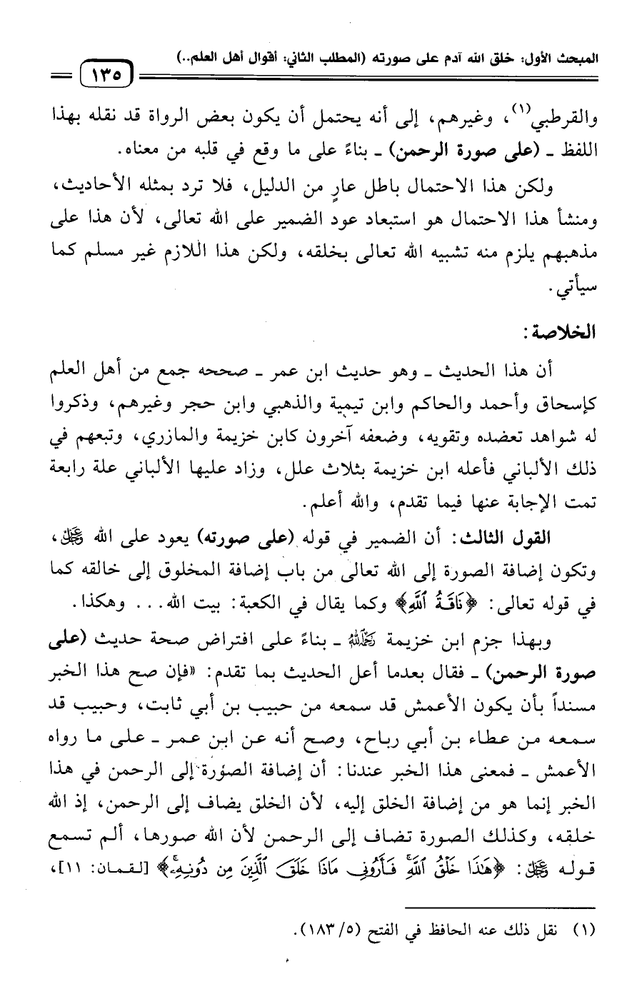 وبهذا جزم ابن خزيمة رحمه الله -بناءً على افتراض صحة حديث (على صورة الرحمن) - فقال بعدما أعل الحديث بما تقدم: "فإن صح هذا الخبر مسندًا بأن يكون الأعمش قد سمعه من حبيب بن أبي ثابت، وحبيب قد سمعه من عطاء بن أبي رباح، وصح أنه عن اين عمر -على ما رواه الأعمش- فمعنى هذا الخبر عندنا: أن إضافة الصورة إلى الرحمن في هذا الخبر إنما هو من إضافة الخلق إليه، لأن الخلق يضاف إلى الرحمن، إذ الله خلقه، وكذلك الصورة تضاف إلى الرحمن لأن الله صورها، ألم تسمع قوله عز وجل: {هَذَا خَلْقُ اللَّهِ فَأَرُونِي مَاذَا خَلَقَ الَّذِينَ مِنْ دُونِهِ} [لقمان: ١١]،