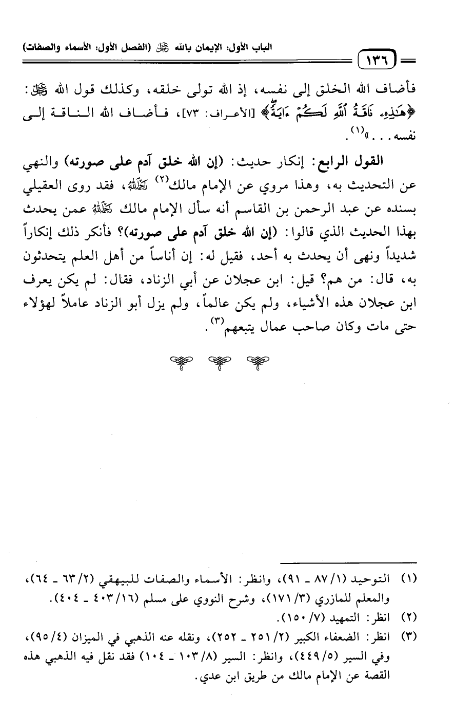 القول الرابع: إنكار حديث: (إن الله خلق آدم على صورته) والنهي عن التحديث به، وهذا مروي عن الإمام مالك (¬٢) رحمه الله، فقد روى العقيلي بسنده عن عبد الرحمن بن القاسم أنه سأل الإمام مالك رحمه الله عمن يحدث بهذا الحديث الذي قالوا: (إن الله خلق آدم على صورته)؟ فأنكر ذلك إنكارًا شديدًا ونهى أن يحدث به أحد، فقيل له: إن أناسًا من أهل العلم يتحدثون به، قال: من هم؟ قيل: ابن عجلان عن أبي الزناد، فقال: لم يكن يعرف ابن عجلان هذه الأشياء، ولم يكن عالمًا، ولم يزل أبو الزناد عاملًا لهؤلاء حتى مات وكان صاحب عمال يتبعهم (¬٣).