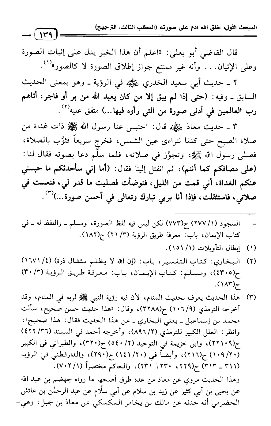 (¬٣) هذا الحديث يعرف بحديث المنام، لأن فيه رؤية النبي -صلى الله عليه وسلم- لربه في المنام، وقد أخرجه الترمذي (٩/ ١٠٦) ح (٣٢٨٨)، وقال: "هذا حديث حسن صحيح، سألت محمد بن إسماعيل -يعني البخاري- عن هذا الحديث فقال: هذا صحيح"، وانظر: العلل الكبير للترمذي (٢/ ٨٩٦)، وأخرجه أحمد في المسند (٣٦/ ٤٢٢) ح (٢٢١٠٩)، وابن خزيمة في التوحيد (٢/ ٥٤٠) ح (٣٢٠)، والطبراني في الكبير (٢٠/ ١٠٩) ح (٢١٦)، وأيضًا في (٢٠/ ١٤١) ح (٢٩٠)، والدارقطني في الرؤية (٣١١ - ٣١٣) ح (٢٢٩، ٢٣٠، ٢٣١)، والحاكم مختصرًا (١/ ٧٠٢).