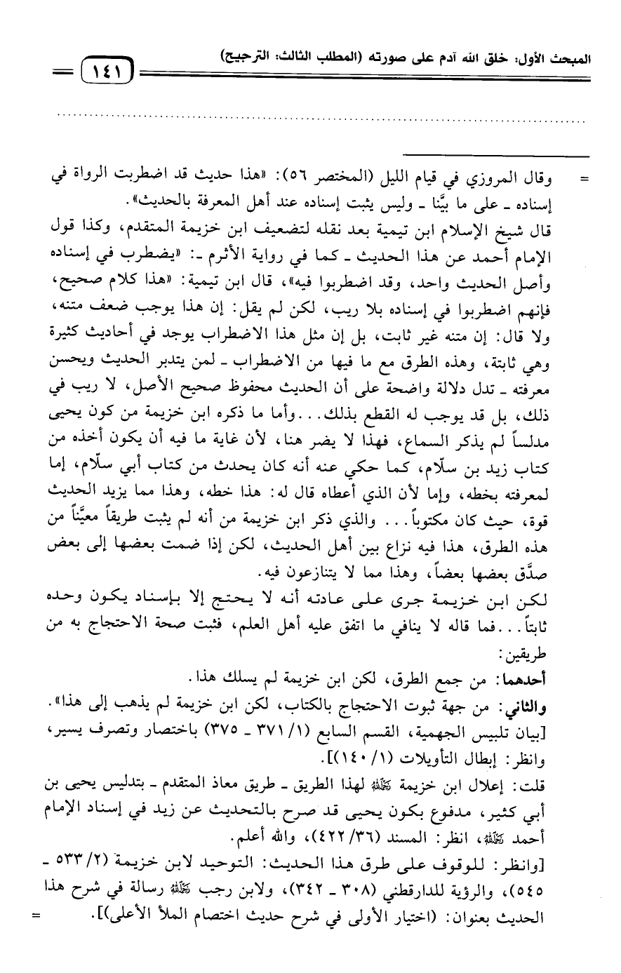 والثاني: من جهة ثبوت الاحتجاج بالكتاب، لكن ابن خزيمة لم يذهب إلى هذا". [بيان تلبيس الجهمية، القسم السابع (١/ ٣٧١ - ٣٧٥) باختصار وتصرف يسير، وانظر: إبطال التأويلات (١/ ١٤٠)].
