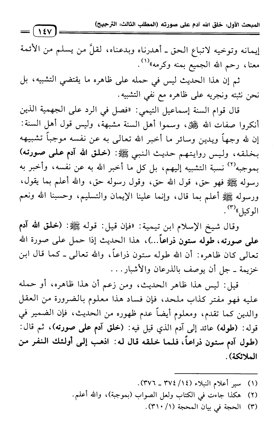 وقال شيخ الإسلام ابن تيمية: "فإن قيل: قوله -صلى الله عليه وسلم-: (خلق الله آدم على صورته، طوله ستون ذراعًا ... )، هذا الحديث إذا حمل على صورة الله تعالى كان ظاهره: أن الله طوله ستون ذراعًا، والله تعالى -كما قال ابن خزيمة- جل أن يوصف بالذرعان والأشبار ...