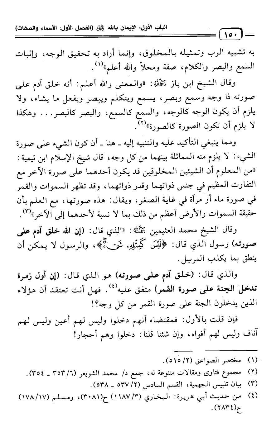 وقال الشيخ ابن باز رحمه الله: "والمعنى والله أعلم: أنه خلق آدم على صورته ذا وجه وسمع وبصر، يسمع ويتكلم ويبصر ويفعل ما يشاء، ولا يلزم أن يكون الوجه كالوجه، والسمع كالسمع، والبصر كالبصر ... وهكذا لا يلزم أن تكون الصورة كالصورة" (¬٢).