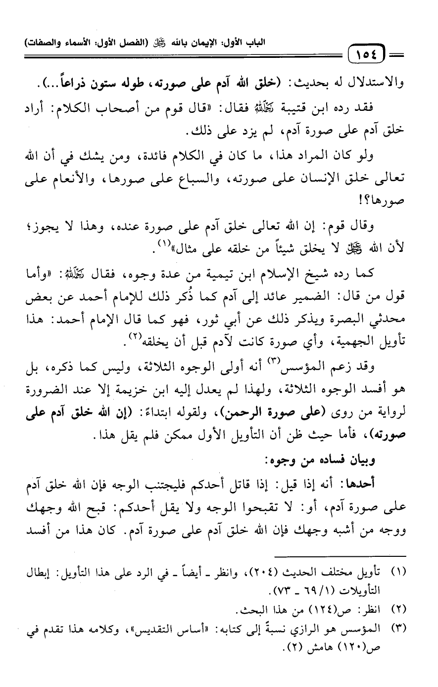 والاستدلال له بحديث: (خلق الله آدم على صورته، طوله ستون ذراعًا ... ). فقد رده ابن قتيبة رحمه الله فقال: "قال قوم من أصحاب الكلام: أراد خلق آدم على صورة آدم، لم يزد على ذلك.