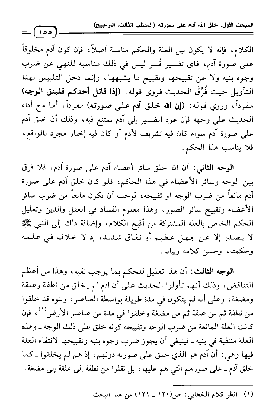 الوجه الثاني: أن الله خلق سائر أعضاء آدم على صورة آدم، فلا فرق بين الوجه وسائر الأعضاء في هذا الحكم، فلو كان خلق آدم على صورة آدم مانعًا من ضرب الوجه أو تقبيحه، لوجب أن يكون مانعًا من ضرب سائر الأعضاء وتقبيح سائر الصور، وهذا معلوم الفساد في العقل والدين وتعليل الحكم الخاص بالعلة المشتركة من أقبح الكلام، وإضافة ذلك إلى النبي -صلى الله عليه وسلم- لا يصدر إلا عن جهل عظيم أو نفاق شديد، إذ لا خلاف في علمه وحكمته، وحسن كلامه وبيانه.