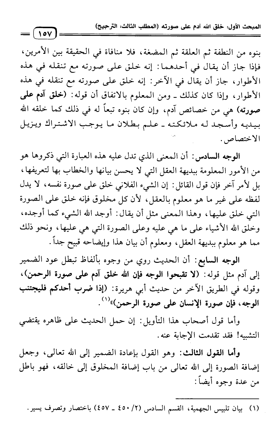 الوجه السابع: أن الحديث روي من وجوه بألفاظ تبطل عود الضمير إلى آدم مثل قوله: (لا تقبحوا الوجه فإن الله خلق آدم على صورة الرحمن)، وقوله في الطريق الآخر من حديث أبي هريرة: (إذا ضرب أحدكم فليجتنب الوجه، فإن صورة الإنسان على صورة الرحمن) " (¬١).