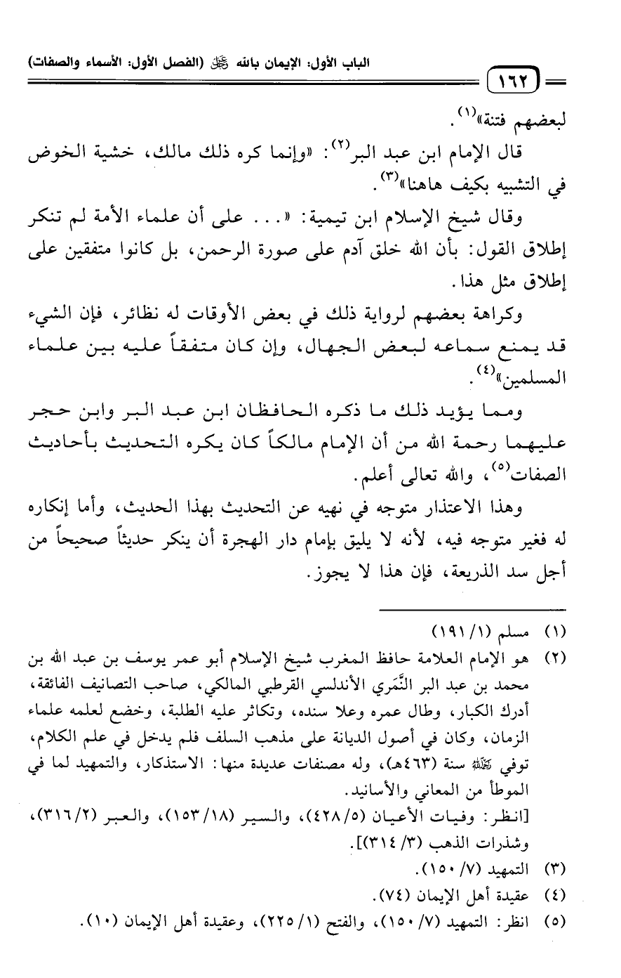 ومما يؤيد ذلك ما ذكره الحافظان ابن عبد البر وابن حجر عليهما رحمة الله من أن الإمام مالكًا كان يكره التحديث بأحاديث الصفات (¬٥)، والله تعالى أعلم.