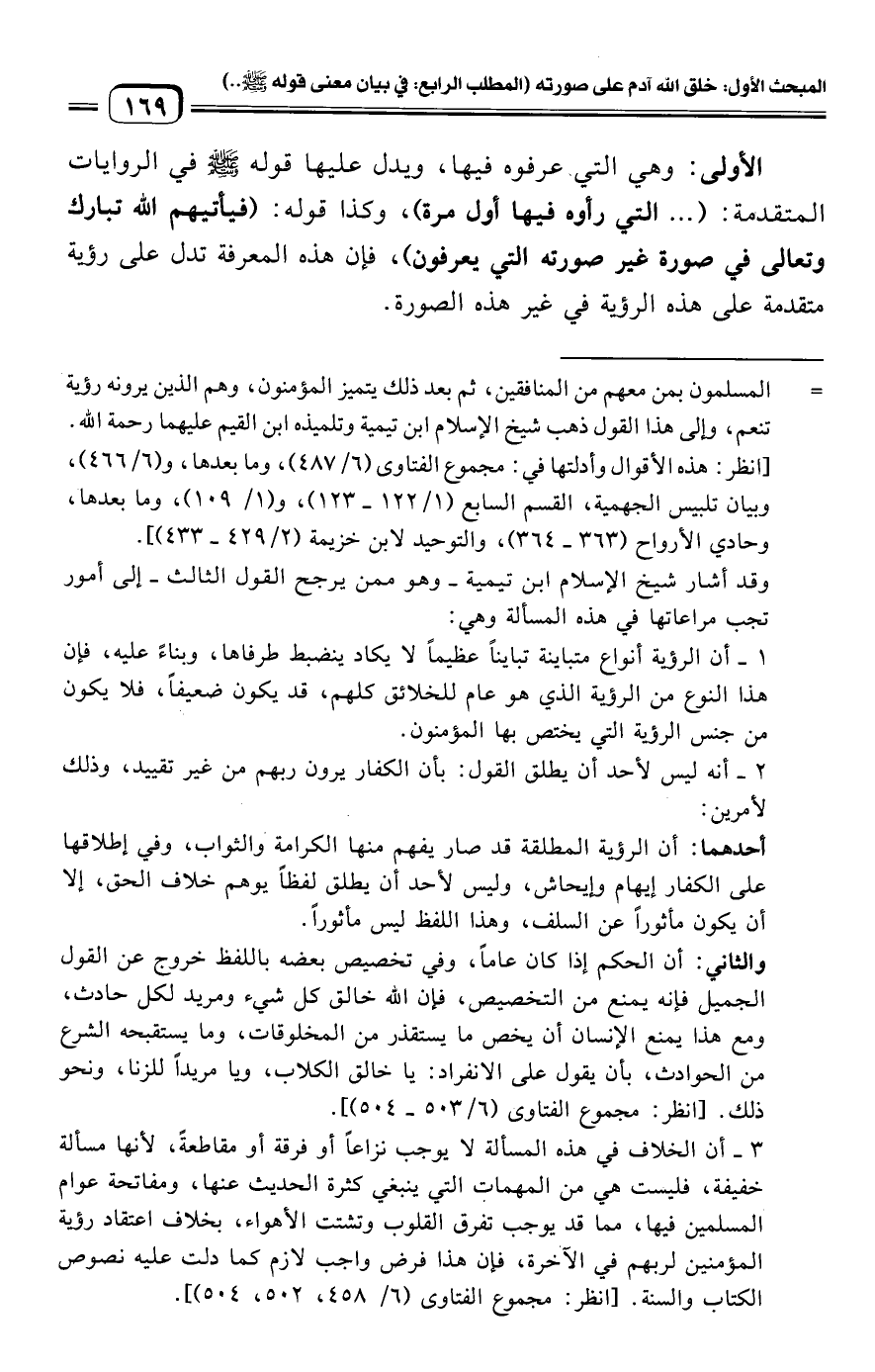 ٣ - أن الخلاف في هذه المسألة لا يوجب نزاعًا أو فرقة أو مقاطعةً، لأنها مسألة خفيفة، فليست هي من المهمات التي ينبغي كثرة الحديث عنها، ومفاتحة عوام المسلمين فيها، مما قد يوجب تفرق القلوب وتشتت الأهواء، بخلاف اعتقاد رؤية المؤمنين لربهم في الآخرة، فإن هذا فرض واجب لازم كما دلت عليه نصوص الكتاب والسنة. [انظر: مجموع الفتاوى (٦/ ٤٥٨، ٥٠٢، ٥٠٤)].