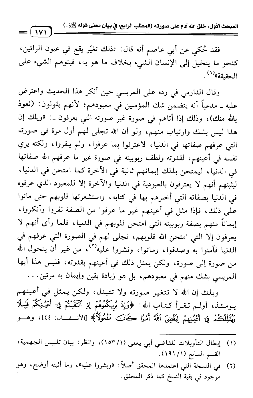 (¬١) إبطال التأويلات للقاضي أبي يعلى (١/ ١٥٣)، وانظر: بيان تلبيس الجهمية، القسم السابع (١/ ١٩١).