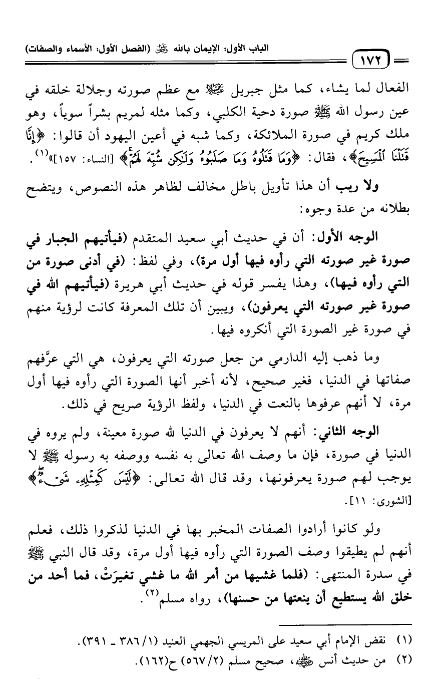 الوجه الأول: أن في حديث أبي سعيد المتقدم (فيأتيهم الجبار في صورة غير صورته التي رأوه فيها أول مرة)، وفي لفظ: (في أدنى صورة من التي رأوه فيها)، وهذا يفسر قوله في حديث أبي هريرة (فيأتيهم الله في صورة غير صورته التي يعرفون)، ويبين أن تلك المعرفة كانت لرؤية منهم في صورة غير الصورة التي أنكروه فيها.