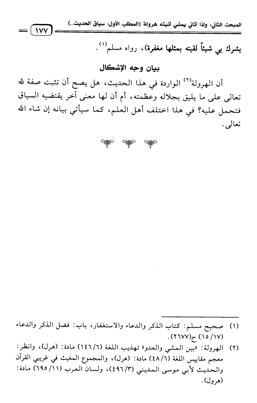 أن الهرولة (¬٢) الواردة في هذا الحديث، هل يصح أن تثبت صفة لله تعالى على ما يليق بجلاله وعظمته، أم أن لها معنى آخر يقتضيه السياق فتحمل عليه؟ في هذا اختلف أهل العلم، كما سيأتي بيانه إن شاء الله تعالى.