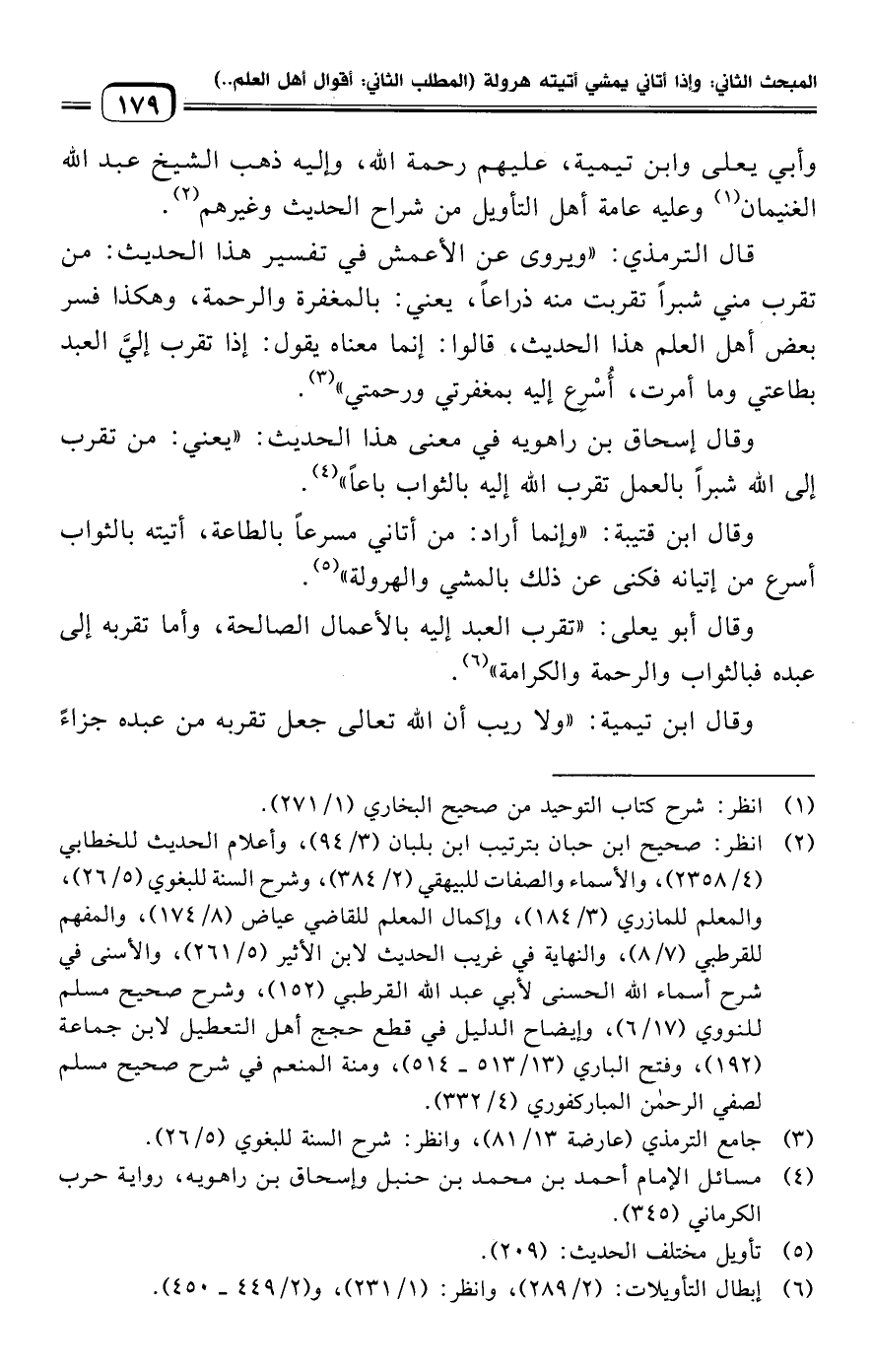 وقال أبو يعلى: "تقرب العبد إليه بالأعمال الصالحة، وأما تقربه إلى عبده فبالثواب والرحمة والكرامة" (¬٦).