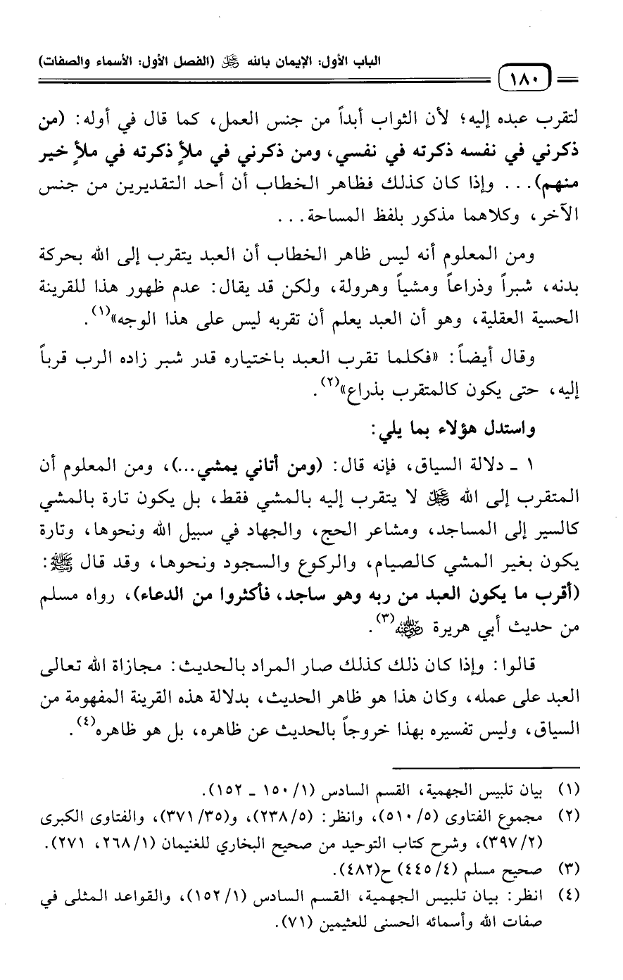 ومن المعلوم أنه ليس ظاهر الخطاب أن العبد يتقرب إلى الله بحركة بدنه، شبرًا وذراعًا ومشيًا وهرولة، ولكن قد يقال: عدم ظهور هذا للقرينة الحسية العقلية، وهو أن العبد يعلم أن تقربه ليس على هذا الوجه" (¬١).