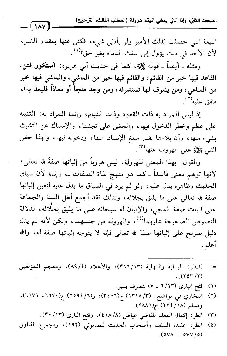 والقول: بهذا المعنى للهرولة، ليس هروبًا من إثباتها صفةً لله تعالى؛ لأنها توهم معنى فاسدًا -كما هو منهج نفاة الصفات-، وإنما لأن سياق الحديث وظاهره يدل عليه، ولو لم يرد في السياق ما يدل عليه لتعين إثباتها صفة لله تعالى على ما يليق بجلاله، ولذلك فقد أجمع أهل السنة والجماعة على إثبات صفة المجيء والإتيان له سبحانه على ما يليق بجلاله، لدلالة النصوص الصحيحة عليهما (¬٤)، والهرولة من جنسهما، ولكن لأنه لم يدل دليل صريح على إثباتها صفة لله تعالى فإنه لا يتوجه إثباتها صفة له، والله أعلم.