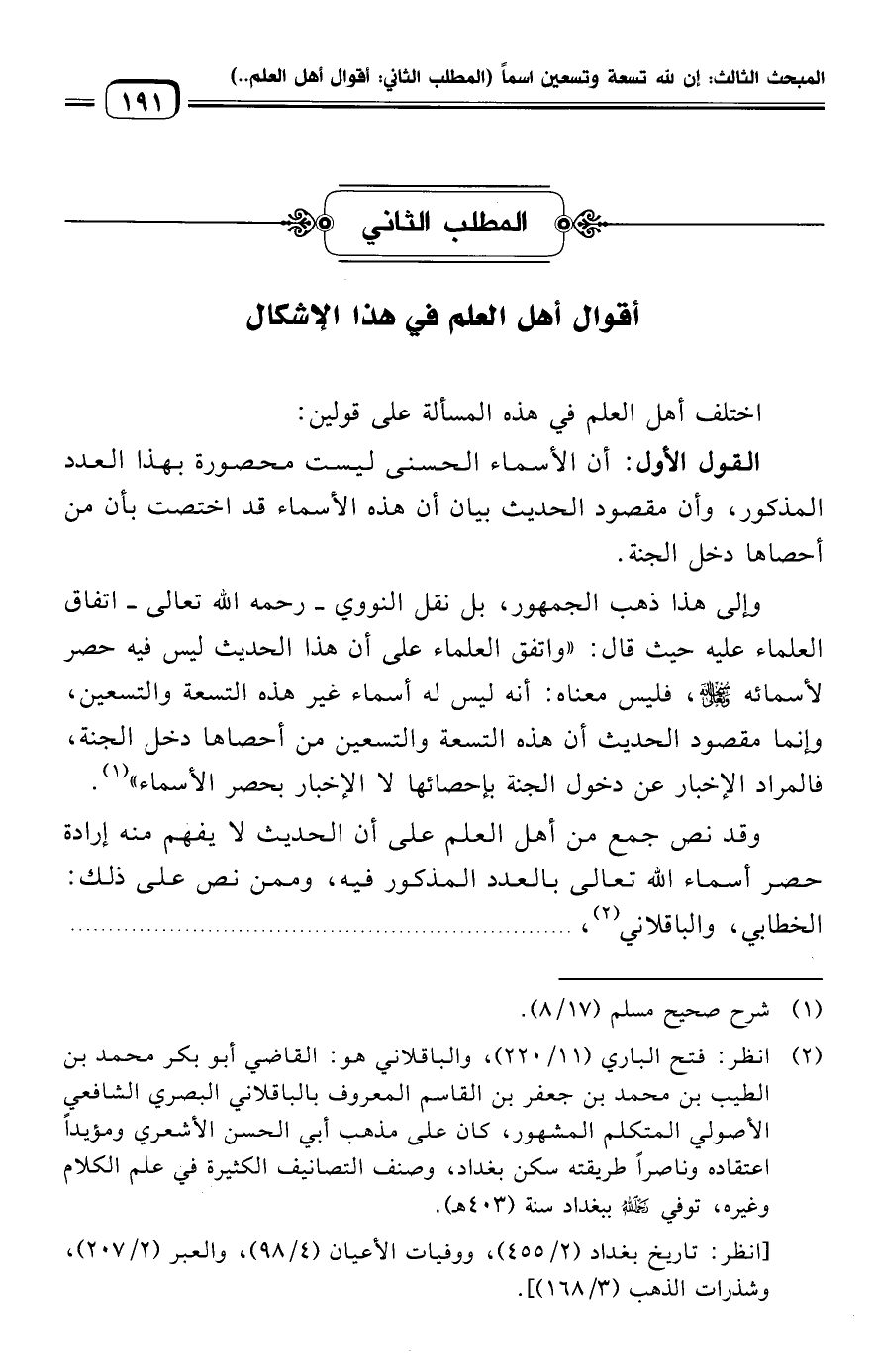 وقد نص جمع من أهل العلم على أن الحديث لا يفهم منه إرادة حصر أسماء الله تعالى بالعدد المذكور فيه، وممن نص على ذلك: الخطابي، والباقلاني (¬٢)، ..................................................................
